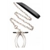 Fabricada en aleación de hierro y zinc, la pinza vulvar es totalmente ajustable y cuenta con tornillos de punta de PVC fáciles de manejar. La robusta cadena, con asa de cuero de PU, añade un toque de refinamiento y control absoluto sobre cada movimiento.