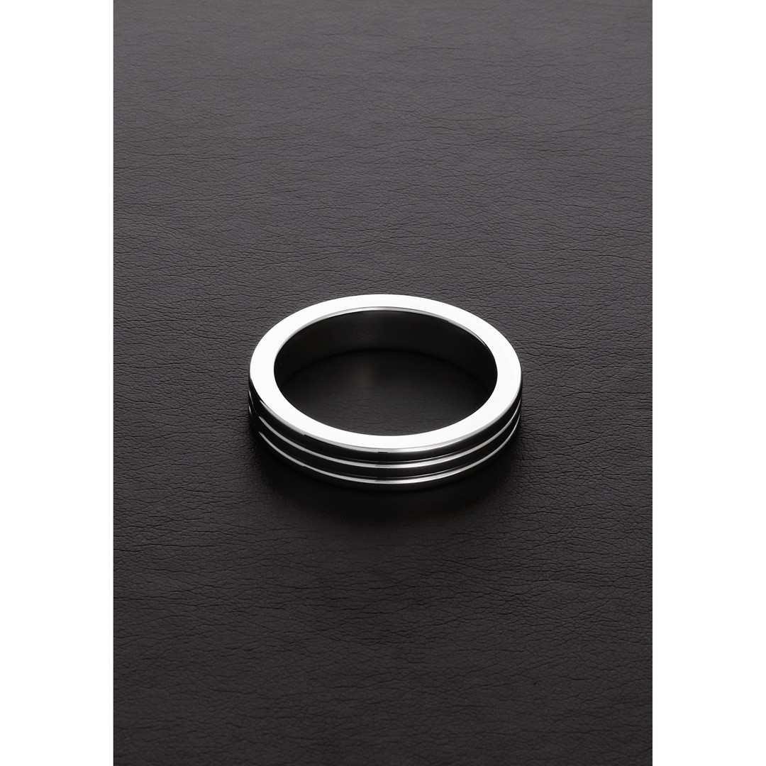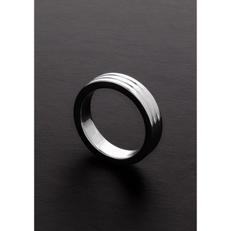 Anillo para el pene de acero inoxidable macizo con acabado estriado. Este anillo ayuda a prolongar la erección y, al mismo tiempo, añade intensidad extra durante su uso.