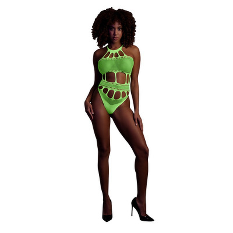 Body neón con escote griego activado por rayos UV, para un look elegante e irresistible que resalta tu silueta.