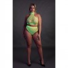 Conjunto neón con cuello alto y tanga de cintura alta activado por rayos UV para un look moderno e impactante.