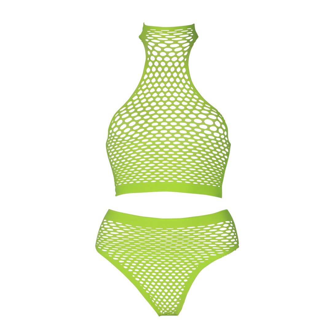 Libera a la diosa que llevas dentro con los materiales activados por UV, que hacen que este conjunto brille en la oscuridad, asegurándote de destacar con un seductor toque de misterio. Elige entre rosa neón o verde neón para un look vibrante y lleno de personalidad.