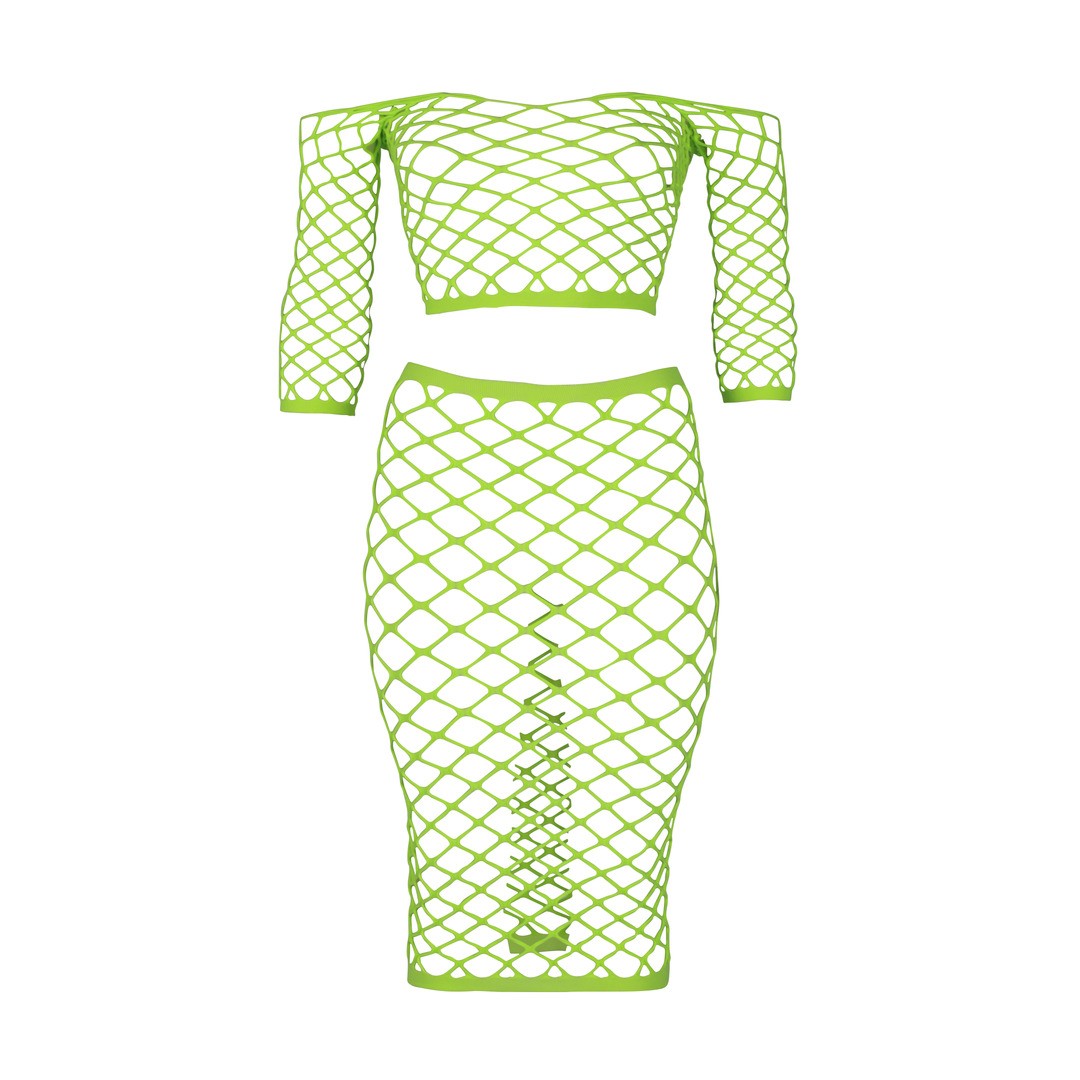 Conjunto Neon UV: top corto y falda larga que brillan bajo la luz ultravioleta, para un look vibrante e irresistible.