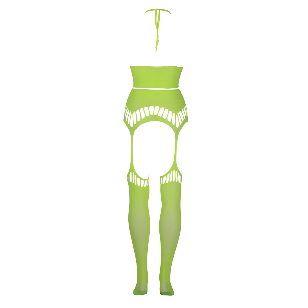 El conjunto incluye un top con escote halter y medias con liguero, creando un look irresistible que combina atrevimiento y elegancia. Ideal para noches de fiesta o momentos íntimos, ofrece ese factor "wow" que nunca pasa desapercibido. Los materiales activados por UV aportan un brillo misterioso y fascinante cuando se apagan las luces, añadiendo un toque de magia a tu experiencia.