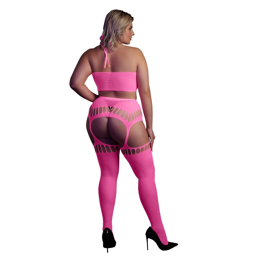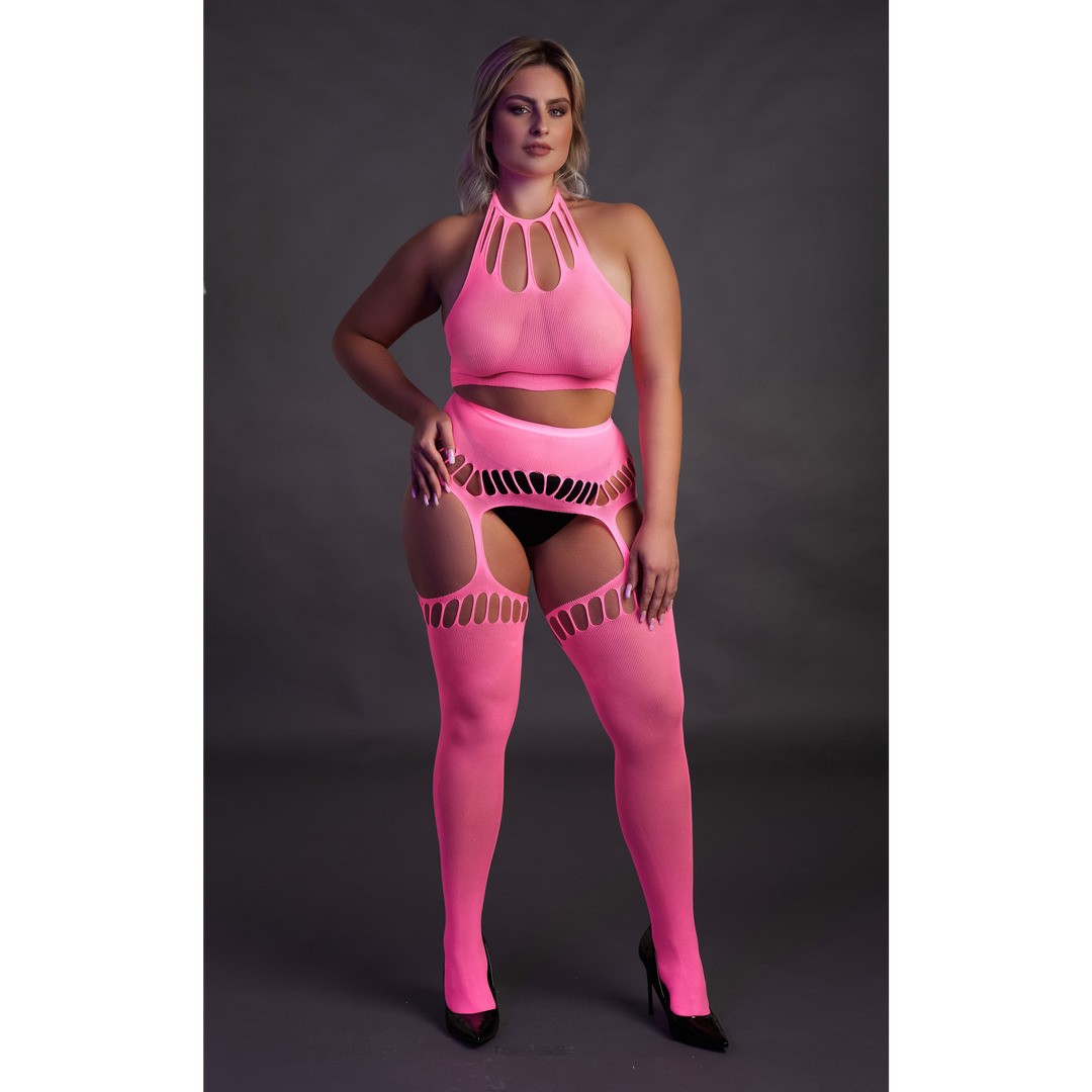 Conjunto Neon UV con top halterneck y medias de ligueros: sensual, vibrante y diseñado para brillar cuando se apagan las luces.