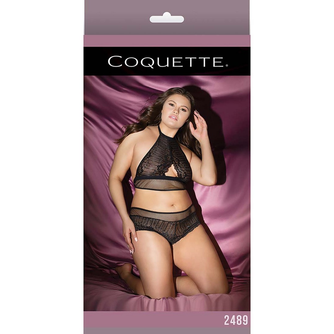Conjunto de encaje y malla, con top en forma de ojo de cerradura y short de encaje, para un look sensual y moderno.