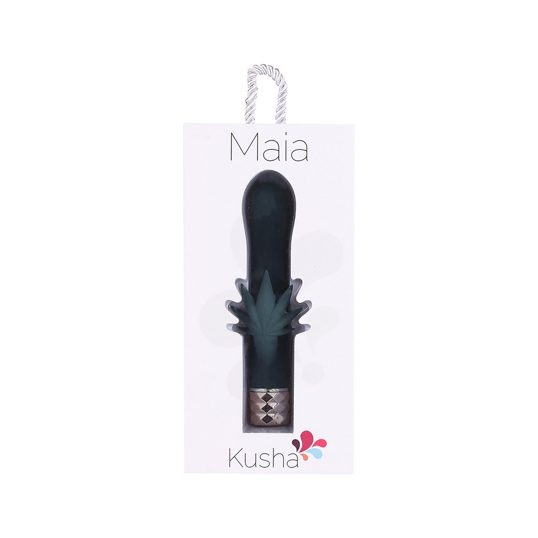 Duplica tu placer con el Kusha de Maia Novelties. Su diseño de doble motor y sus 10 funciones proporcionan intensas vibraciones en el clítoris, la vagina o el punto G. El estimulador de clítoris, con forma de hoja de cáñamo, envuelve y acaricia suavemente el punto de placer. La cabeza bulbosa permite la estimulación del punto G, mientras que el eje es lo suficientemente largo para los placeres vaginales profundos.