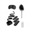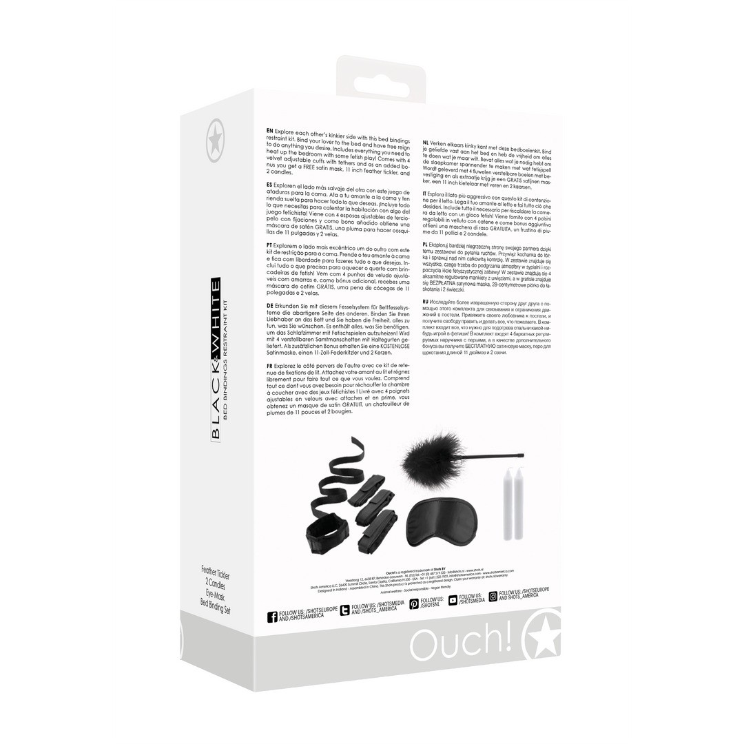 El conjunto de restricciones de cama incluye unas esposas de terciopelo, un antifaz de satén, un cosquilleador de plumas y velas, creando el escenario perfecto para juegos sensuales y absorbentes.