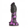 Dildo Monster de silicona morada y negra, con un diseño texturizado y pinchos para una estimulación intensa. La base tiene ventosas y es compatible con un arnés, por lo que es ideal para juegos oscuros y fantasías atrevidas.