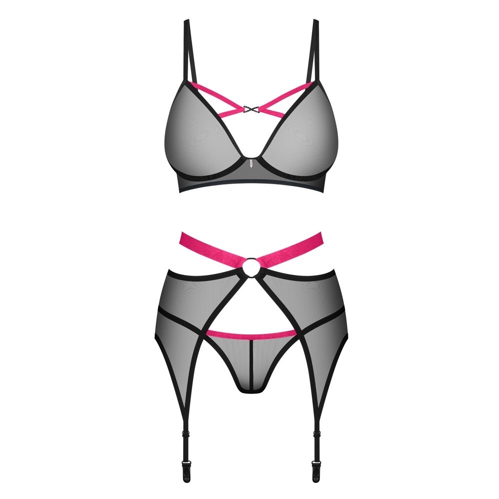 El conjunto de ligueros de 3 piezas, Novenes de Obsessive, tiene un sujetador sin aros, un liguero y un tanga.
