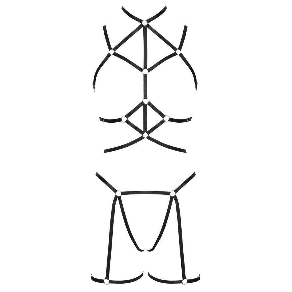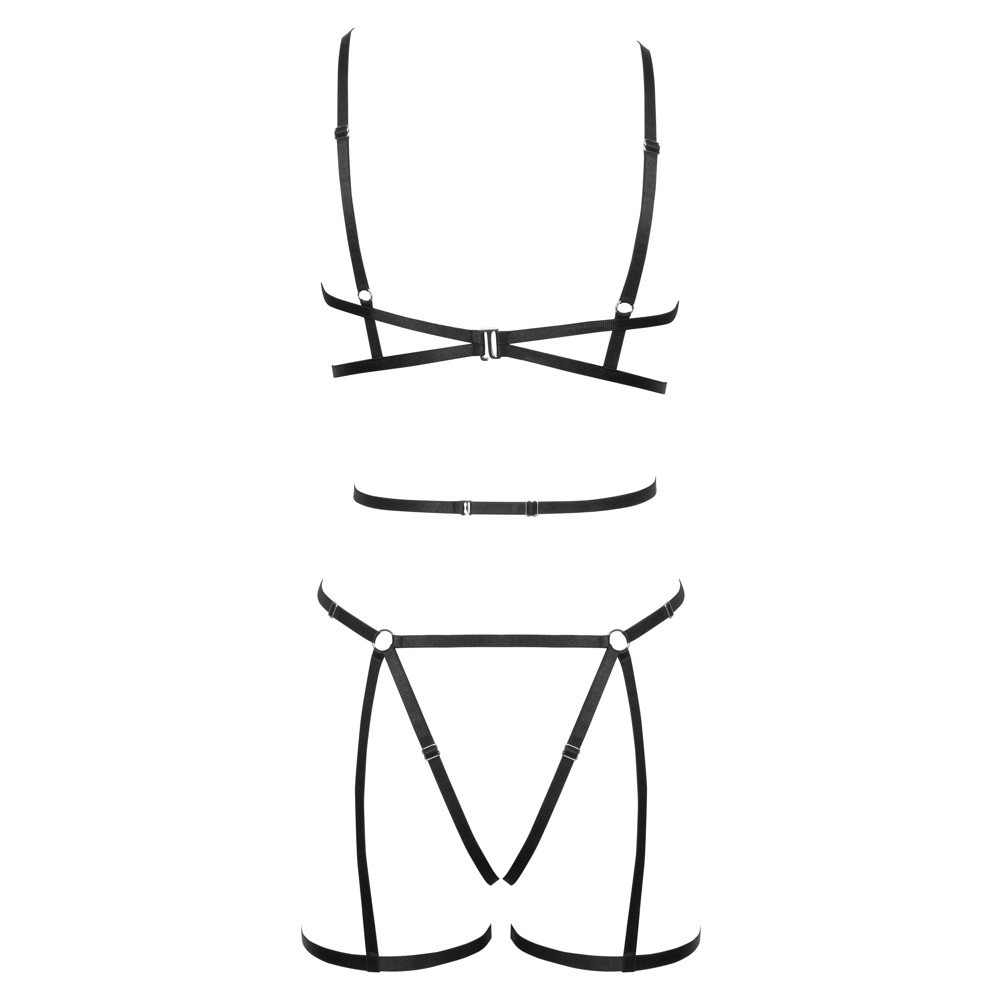 El conjunto de arnés negro de 3 piezas de Cottelli LINGERIE incluye un arnés para el pecho y otro para las caderas. También incluye un pequeño tanga. Ambos arneses están hechos de tiras elásticas aterciopeladas, suaves y brillantes, con anillas de conexión plateadas. Las tiras se pueden ajustar para un ajuste perfecto. Hay 2 cierres de gancho en la parte superior: uno en la parte posterior del cuello y otro en la espalda.
