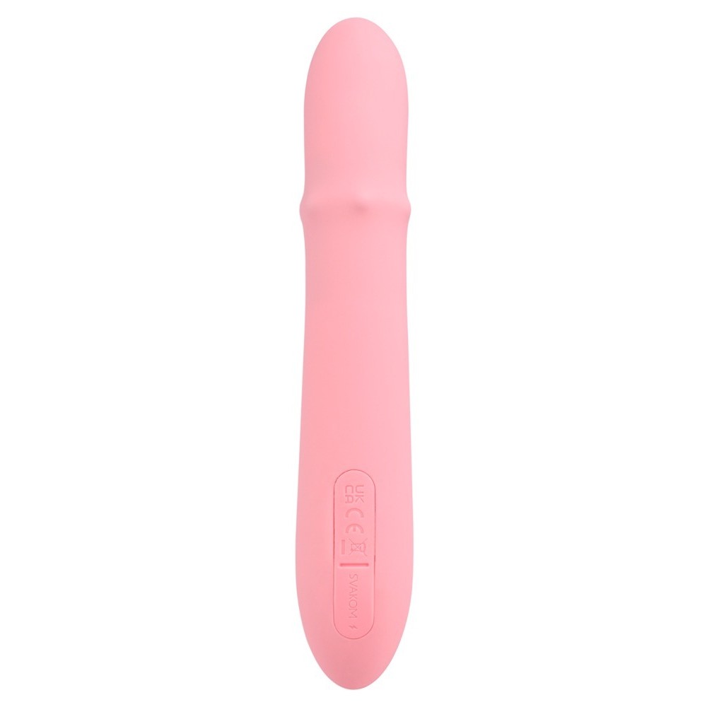 placea la vagina, el punto G y el clítoris al mismo tiempo. También cuenta con vibraciones versátiles y un anillo de perlas en el eje que se mueve hacia arriba y hacia abajo para masajear la vagina muy intensamente. Las silenciosas funciones pueden controlarse y combinarse fácilmente con sólo pulsar un botón. Los ajustes individuales de vibración, el juego a distancia y las interacciones con tu pareja son posibles con la app SVAKOM. Los vídeos y las cámaras web también se pueden utilizar de forma interactiva con la app FeelConnect.