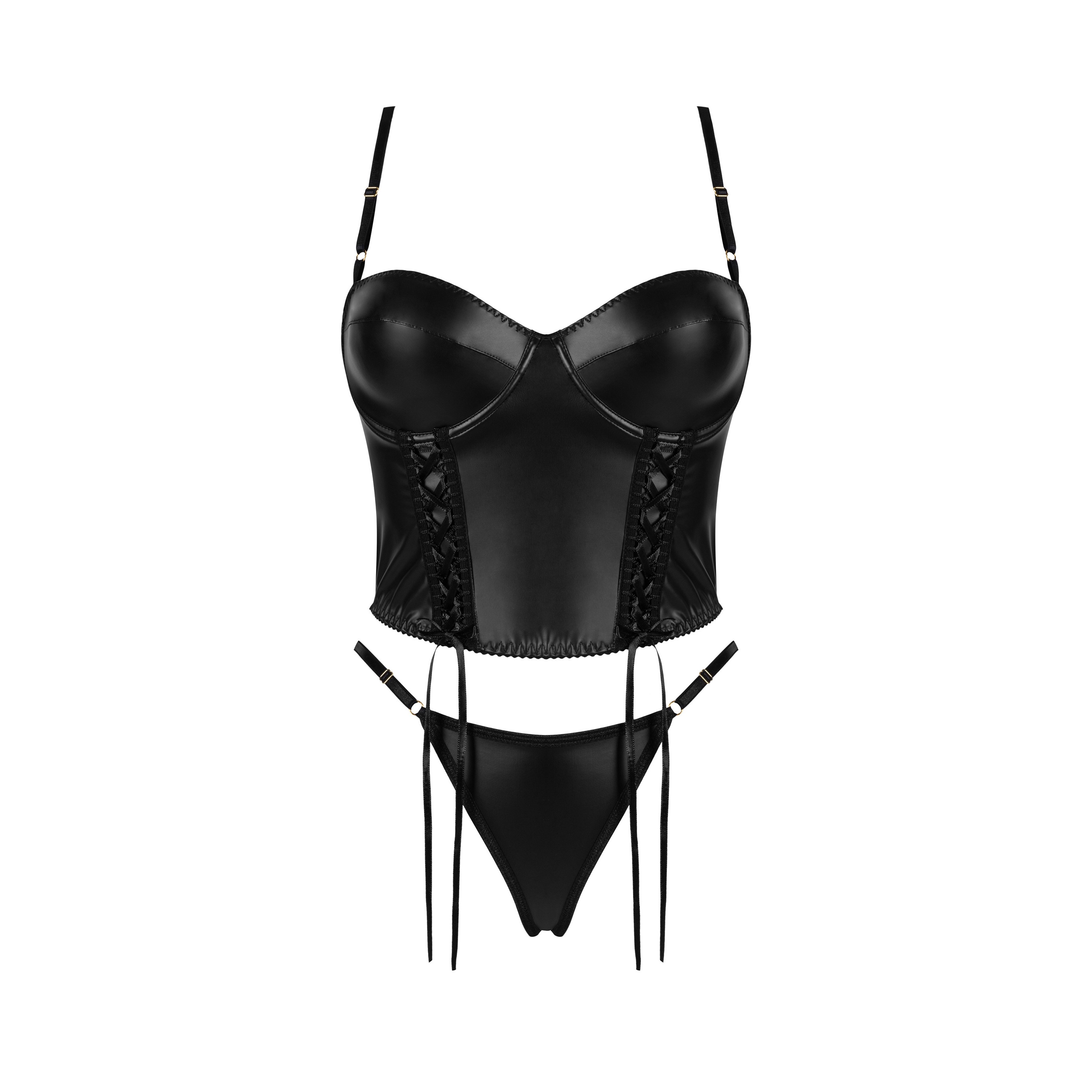 Un conjunto sexy confeccionado en ecopiel de color negro, perfecto para las mujeres que desean resaltar su confianza y su estilo único. El top corto - corsé con copas con aros proporciona una excelente sujeción del busto, y el cordón decorativo de la parte delantera añade un toque feroz al conjunto.