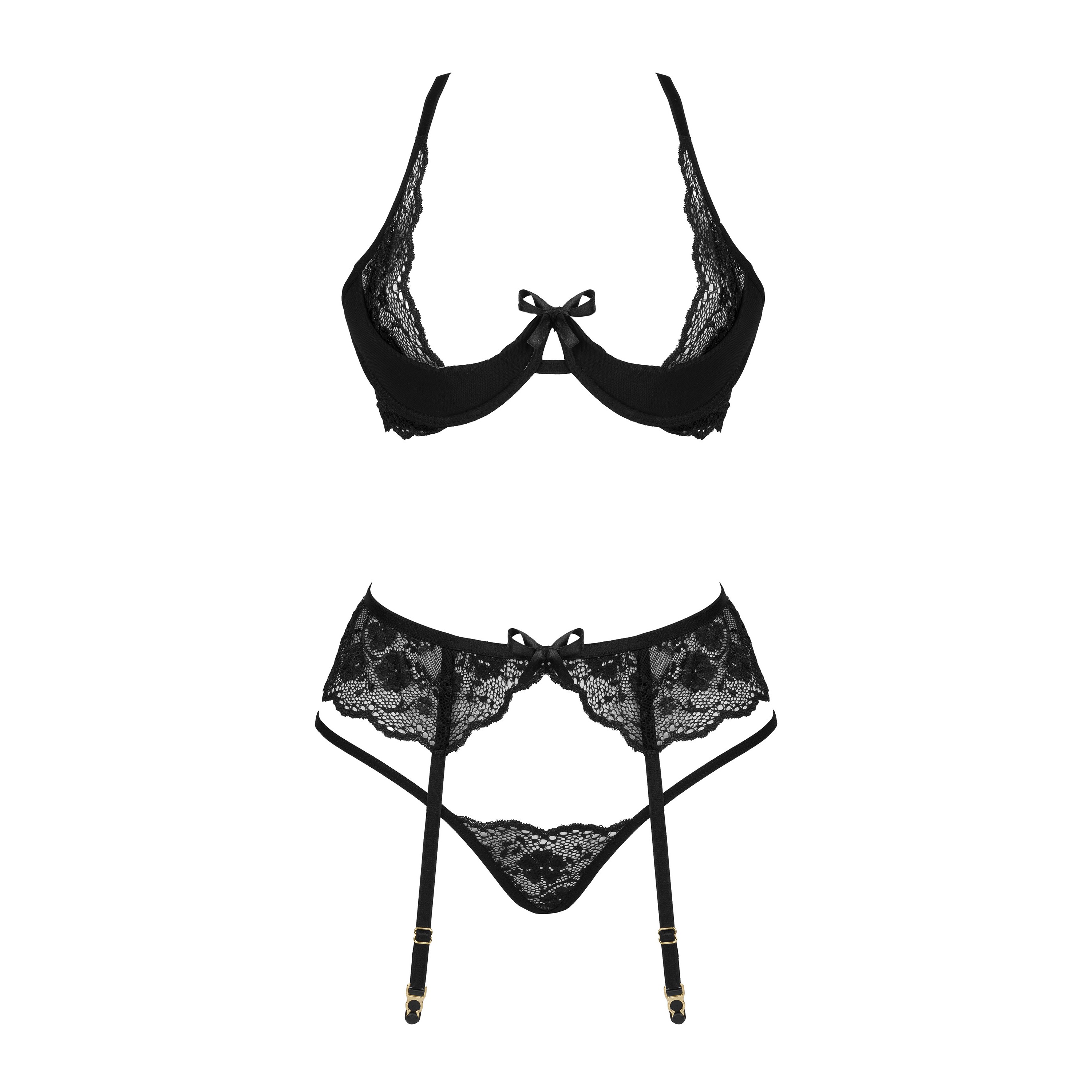 Descubre el sensual Rose Set Black, un exquisito conjunto de lencería que incluye sujetador, tanga y liguero.
