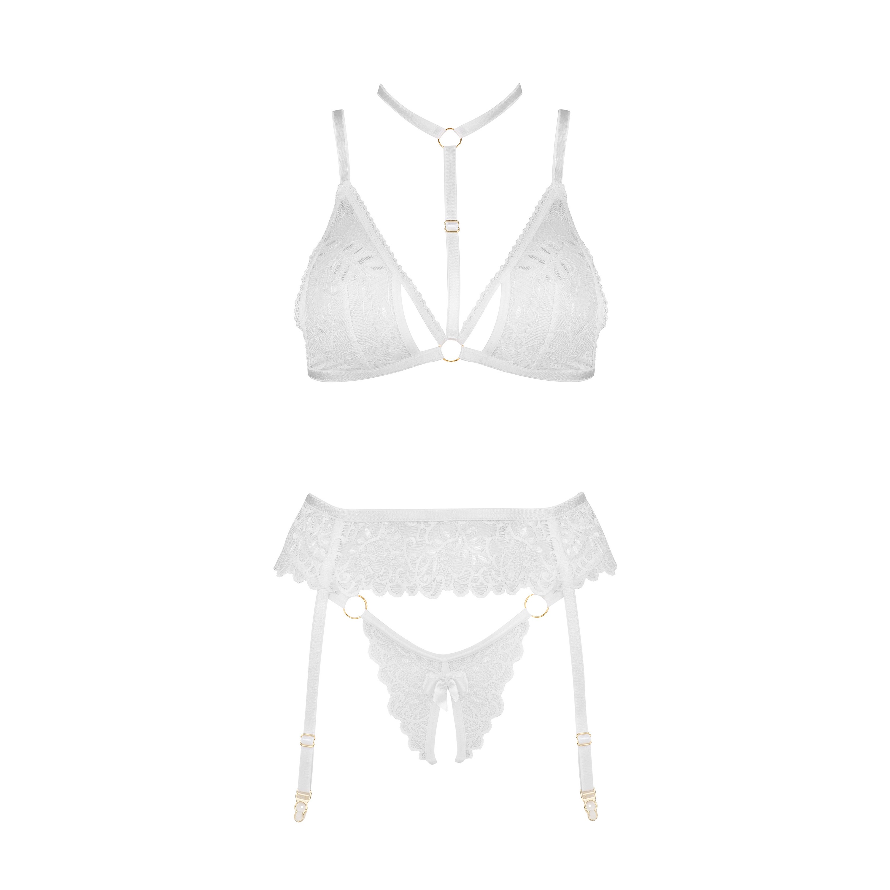 Descubre el excepcional conjunto de lencería Noemi set blanco, compuesto por sujetador, tanga y liguero, que sin duda os encantará tanto a ti como a tu pareja.