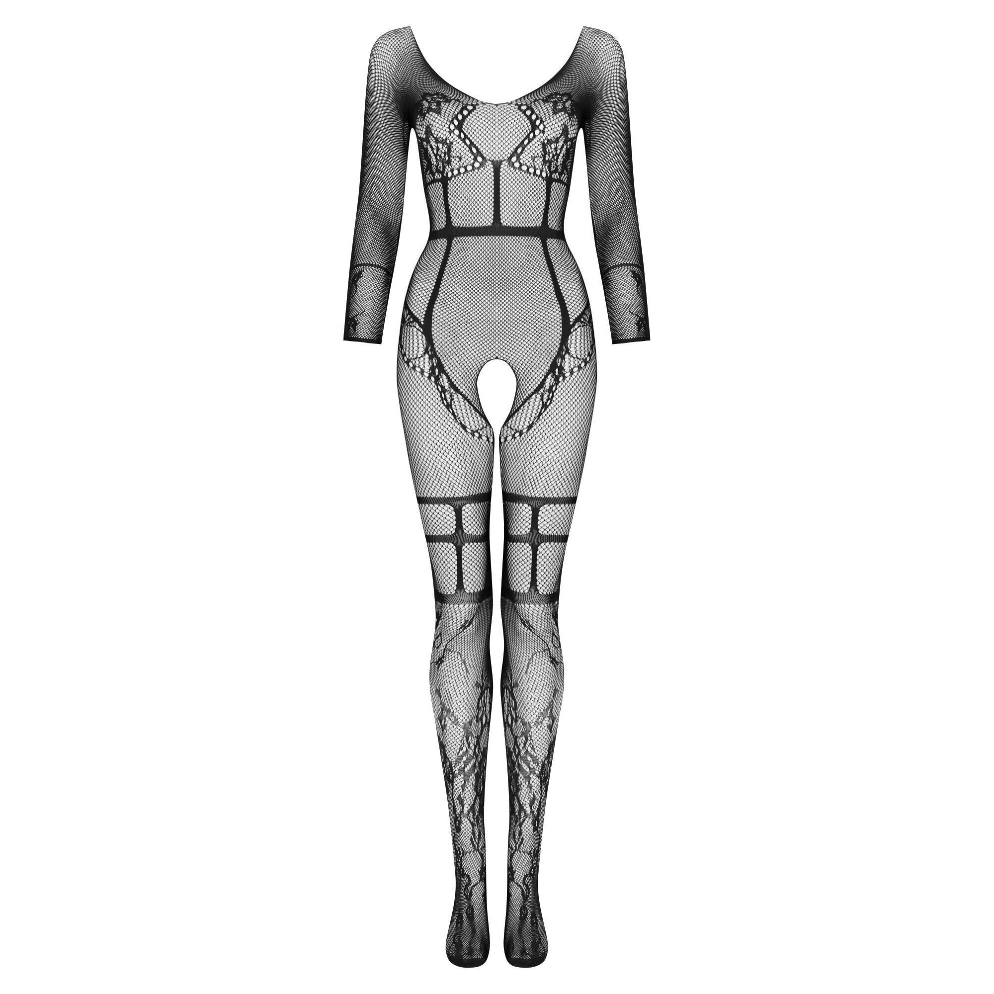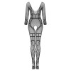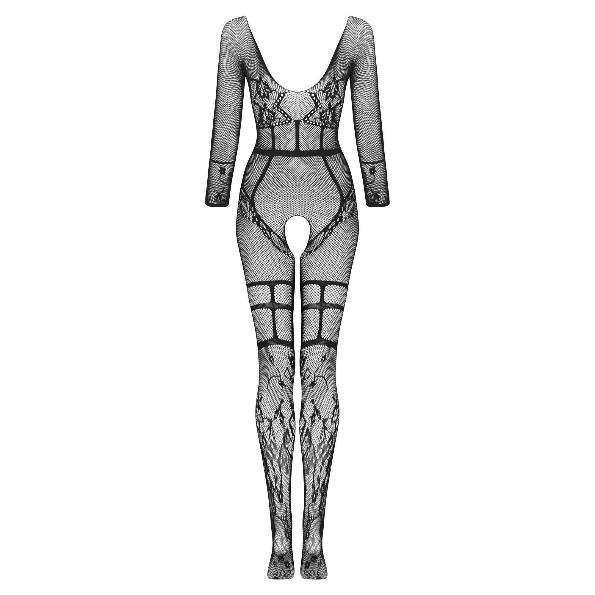 Catsuit super sexy para las amantes de la ropa interior cómoda, confeccionado en delicado hilo negro. El motivo de rejilla se complementa con impresionantes aplicaciones florales y tirantes en la cintura y los muslos.