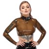 El crop top de LateX está hecho de látex natural (pegado) en un color ahumado transparente. Tiene mangas largas y un gran aro metálico decorativo en la parte delantera, debajo del elegante cuello alto. Tiene una cremallera completa en la espalda que facilita ponérselo y quitárselo.