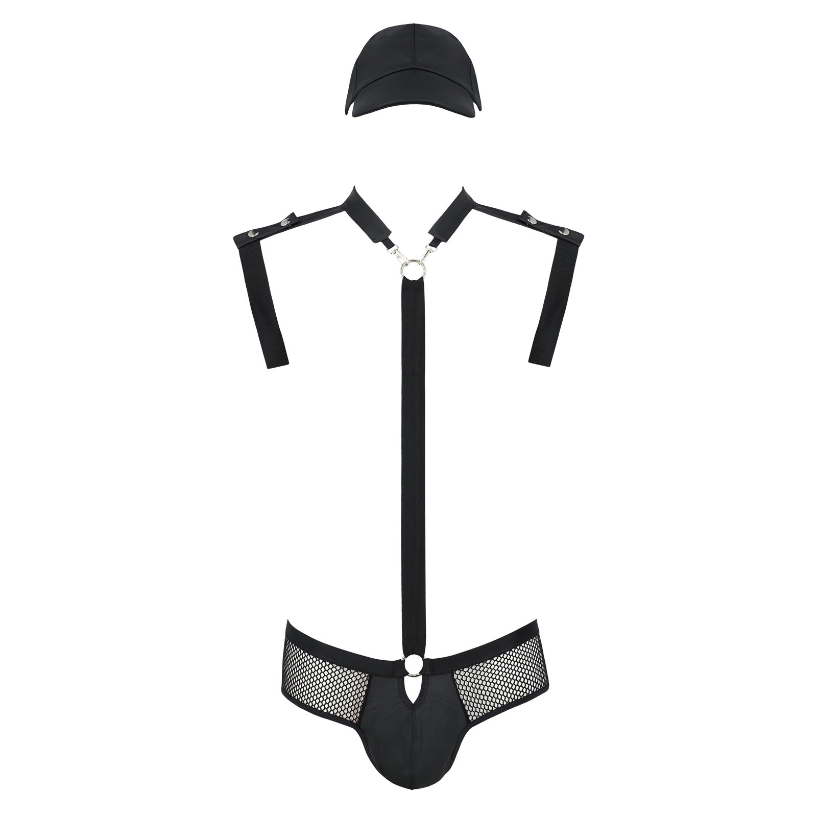 Está hecho de cuero ecológico combinado con una tentadora malla. Las bandas que recorren el torso y los hombros añaden carácter y realzan la silueta masculina.