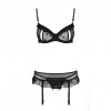 Compuesto por un sujetador, un tanga y un liguero, este conjunto encanta por sus detalles sofisticados y tentadores.