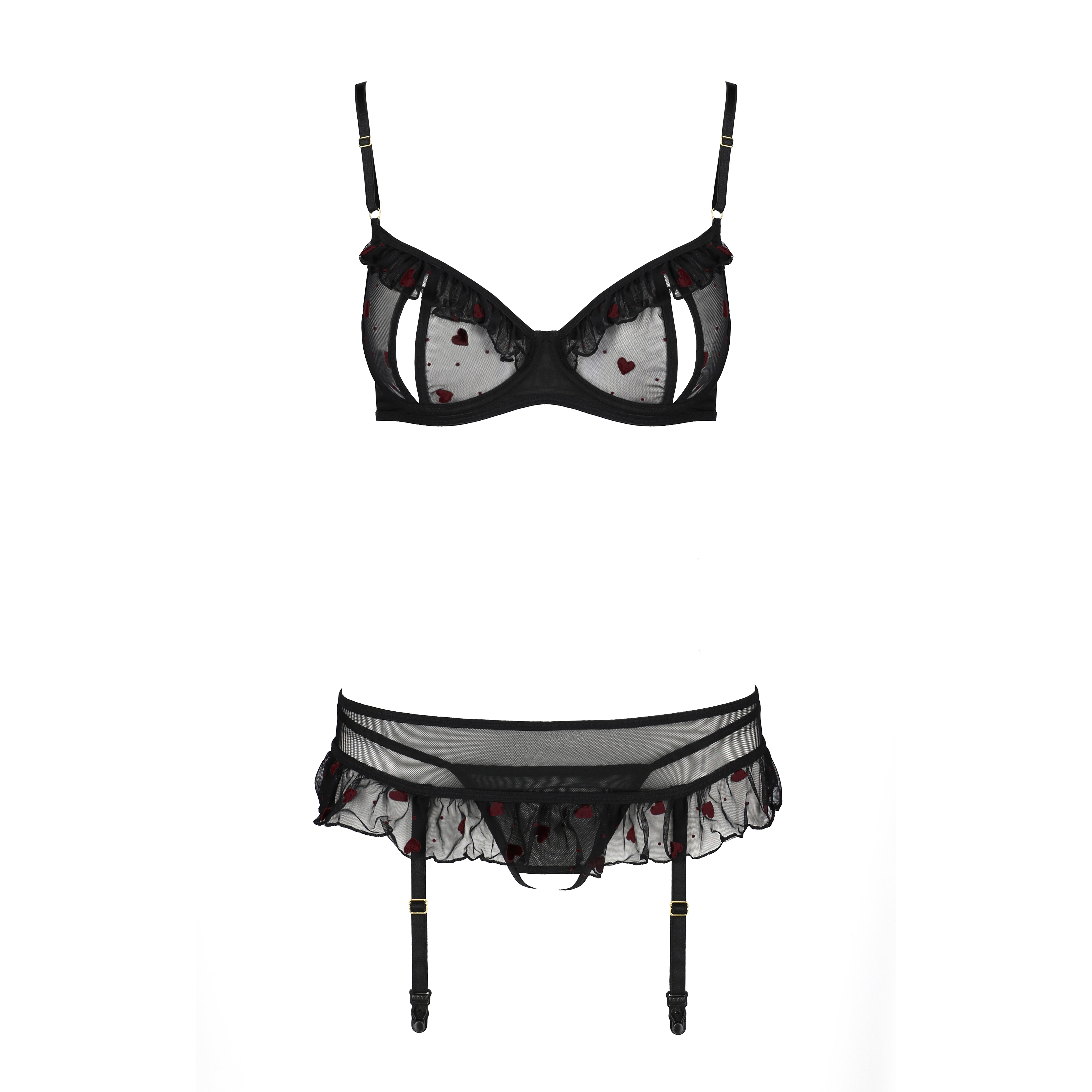 El conjunto Lovelia de 3 piezas en tul con estampado de corazones incluye un sujetador con sensuales aberturas, un delicado liguero y un tanga abierto, creando un look romántico e irresistible.