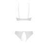 El sujetador, con delicadas copas de encaje, realza el escote, mientras que los tirantes ajustables garantizan un ajuste perfecto y cómodo. El tanga abierto entre las piernas realza las curvas femeninas con detalles de encaje, añadiendo un toque de sensualidad y elegancia.