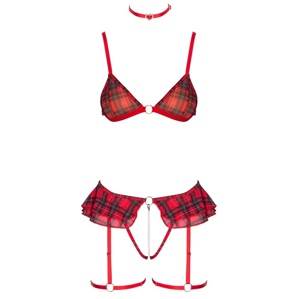 El atrevido conjunto de lencería de Cottelli COSTUMES contiene un sujetador sin aros, un liguero sin entrepierna y una gargantilla. El conjunto es de cuadros rojos y tiene detalles de fantasía. El sujetador tiene un aro entre las copas inalámbricas. Los tirantes del sujetador se pueden ajustar. El string sin entrepierna también tiene un cordón en la parte delantera, así como 2 capas de material con volantes en la cintura. La estimulante cadena de perlas va por encima de la entrepierna, pero se puede quitar Los tirantes ajustables de los ligueros con tiras ajustables en los muslos también se pueden quitar. La estrecha gargantilla roja tiene un corazón de strass y un cierre de clip, por lo que se puede ajustar a la medida.
