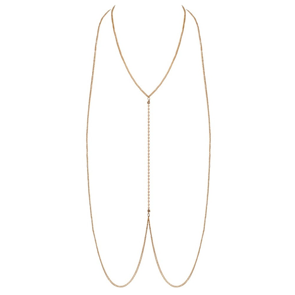 La Body Chain dorada de Cottelli ACCESSOIRES está formada por 2 largas cadenas doradas unidas por una cadena de strass de 19 cm de largo. Con una cadena de extensión (15 cm de largo) que se puede ajustar con el cierre de mosquetón. Se puede llevar sobre el cuerpo desnudo para un look elegante y erótico. La cadena para el cuerpo también se puede llevar con elegantes trajes de baño o conjuntos ajustados.