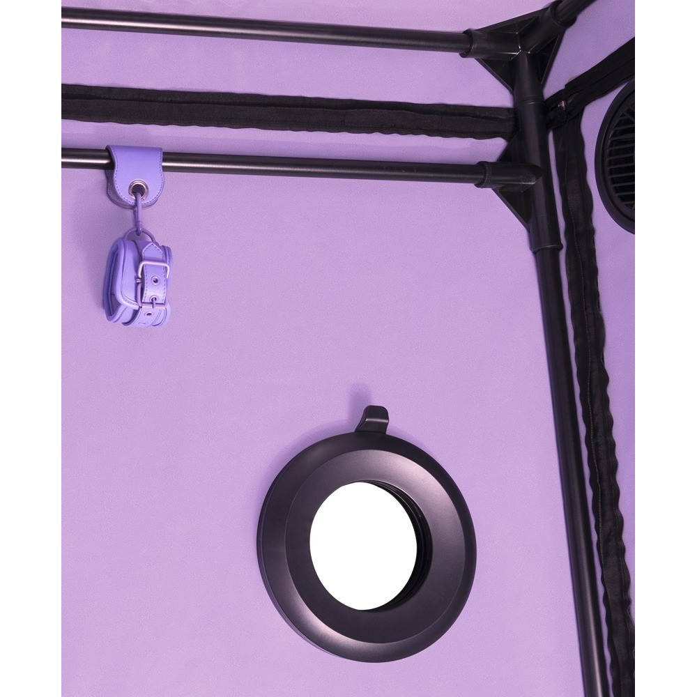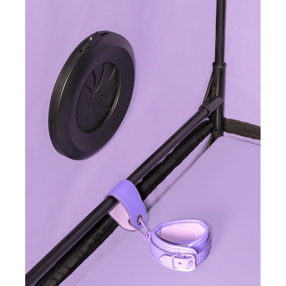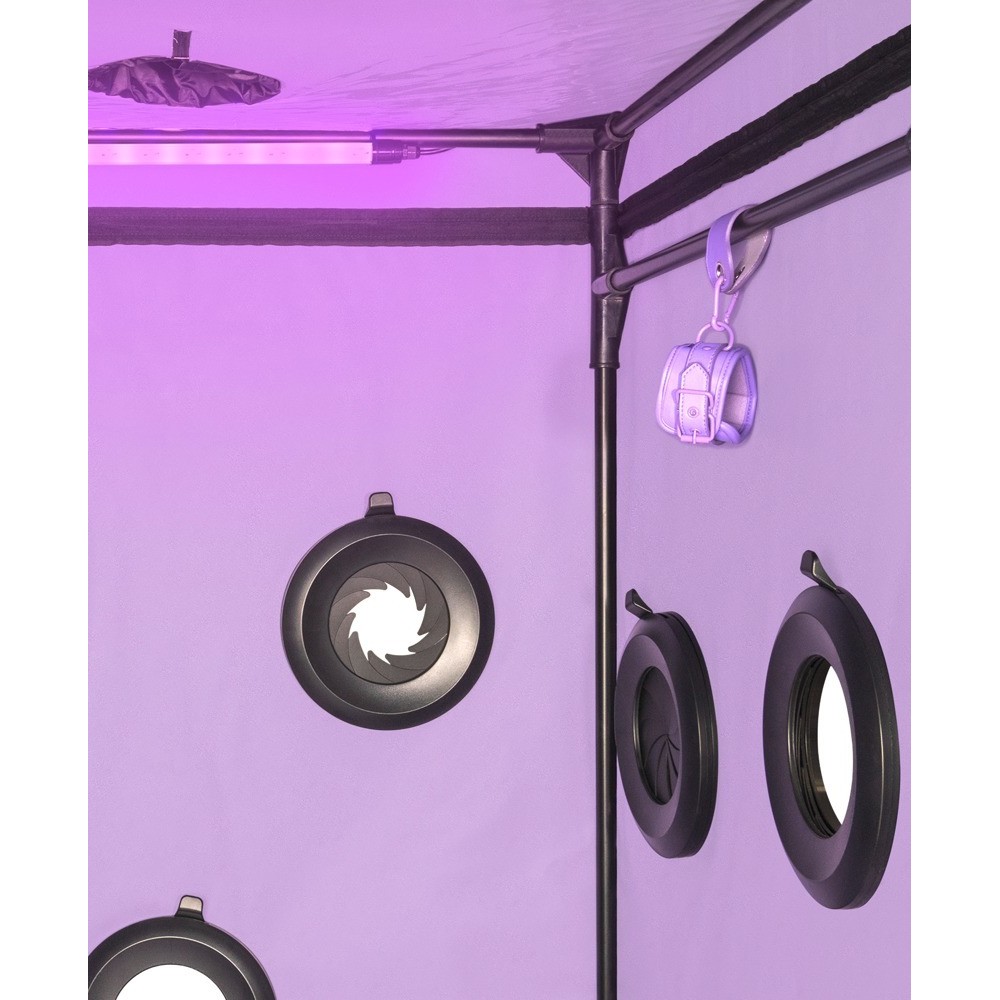 La caja cerrada BDSM, Scandale de Secret Dome, es perfecta para la diversión en agujeros de gloria, juegos oscuros, cautivadores juegos de rol y otras fantasías. La robusta caja, con su sistema de tubo enchufable y su robusta tapa opaca, se monta rápidamente y estará lista para usar en un abrir y cerrar de ojos. El orificio para la cabeza tiene una cremallera y un cuello ancho y ajustable. Hay 9 orificios (3 por lado) que pueden cerrarse completamente con solapas. También ofrece un cómodo acceso a través de la puerta lateral con cremallera. Los 2 ventiladores y la iluminación LED garantizan una ventilación y una iluminación óptimas en una caja que, de otro modo, estaría completamente a oscuras. Hay una alfombrilla blanda en el suelo para mayor comodidad. Las esposas y tobilleras incluidas (1 juego de cada) pueden colocarse en el interior según sea necesario. Las suaves esposas acolchadas se pueden poner y ajustar rápidamente con los cierres de hebilla.