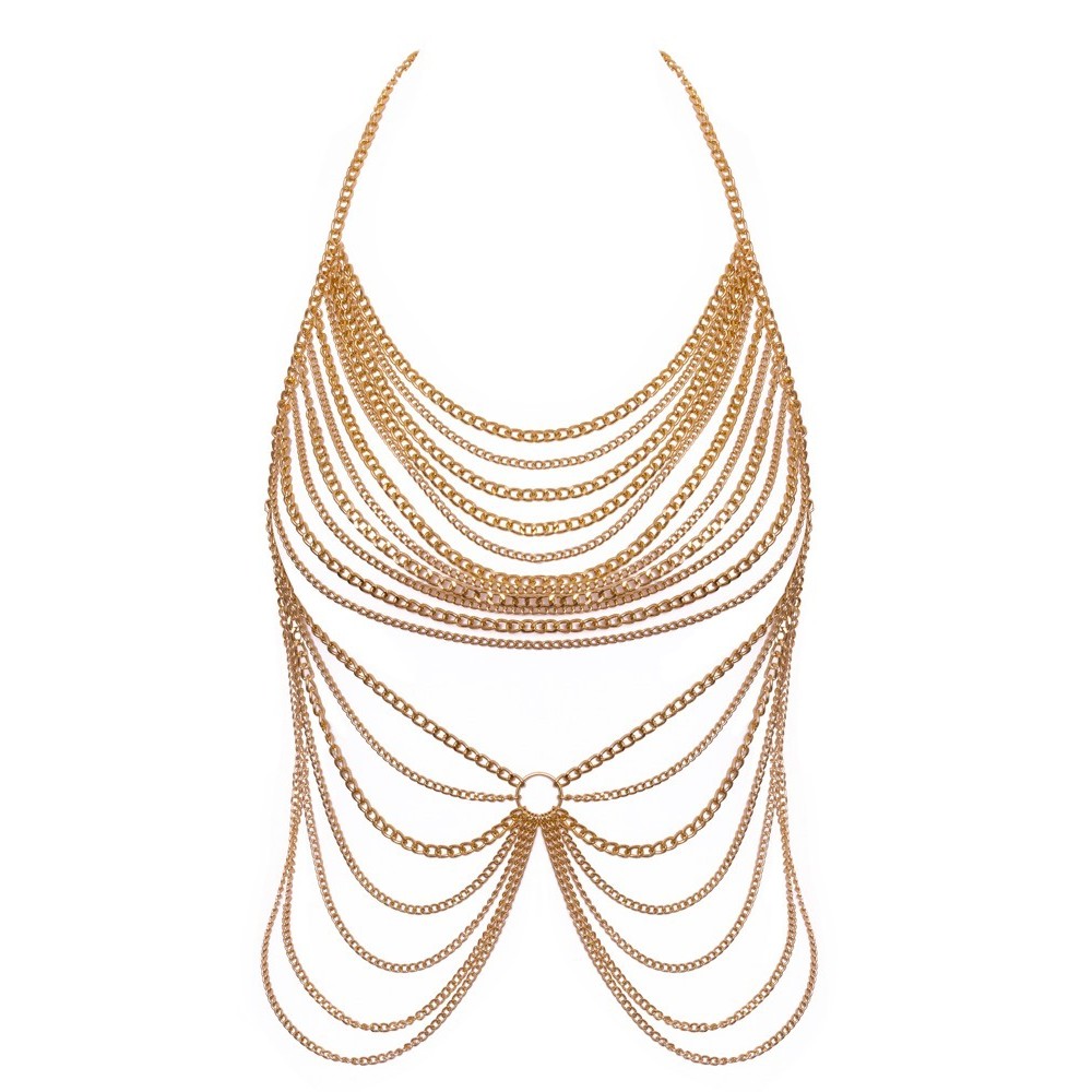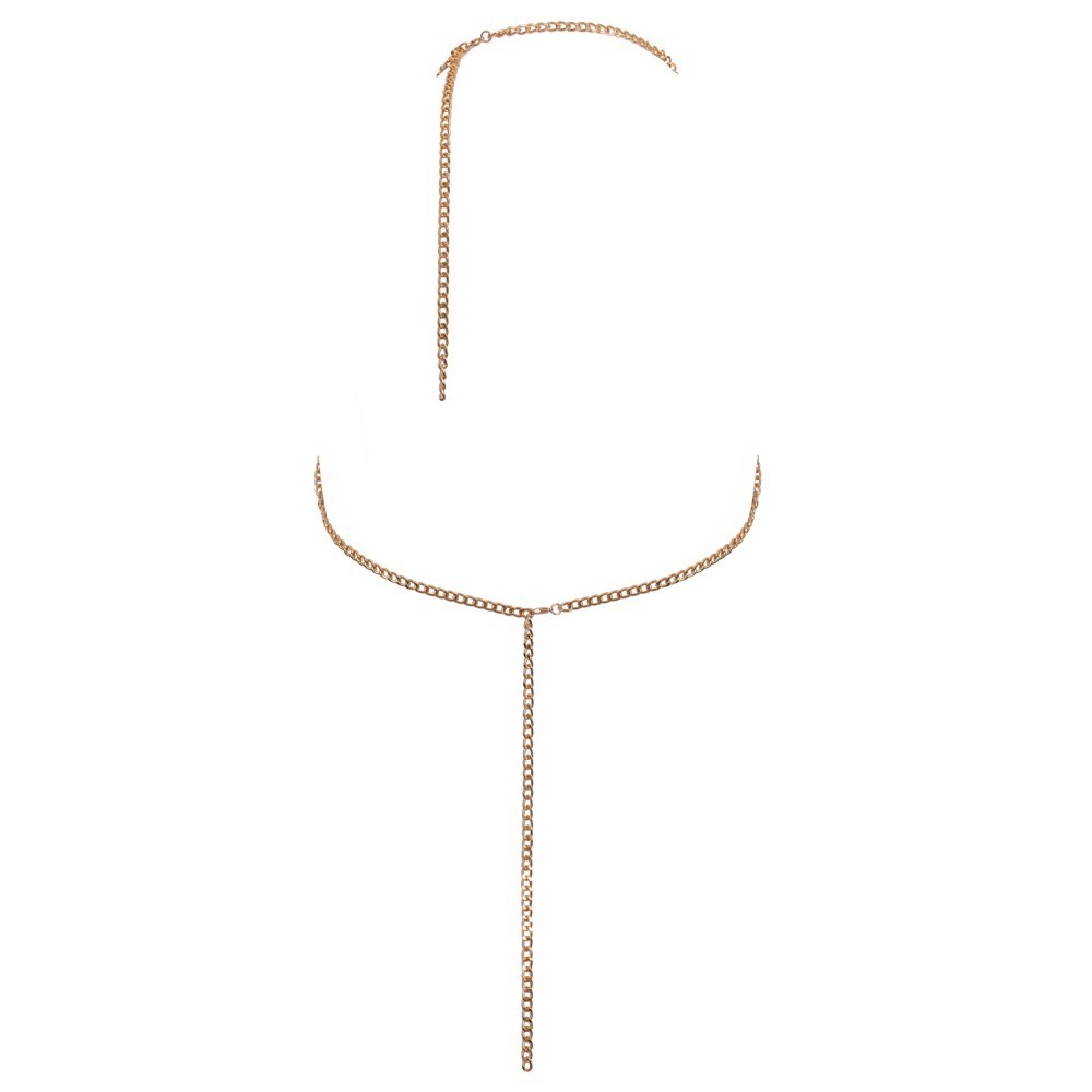 La cadena corporal dorada de Cottelli ACCESSOIRES presenta una lujosa decoración de cadenas sobre los pechos y el vientre. Cuenta con un gancho de presión en la parte posterior del cuello y en la parte posterior de la cintura para ajustarla. Se puede usar solo, como lencería erótica, o junto con trajes de baño ajustados, como un bonito extra: ¡la decoración glamurosa es un verdadero reclamo!