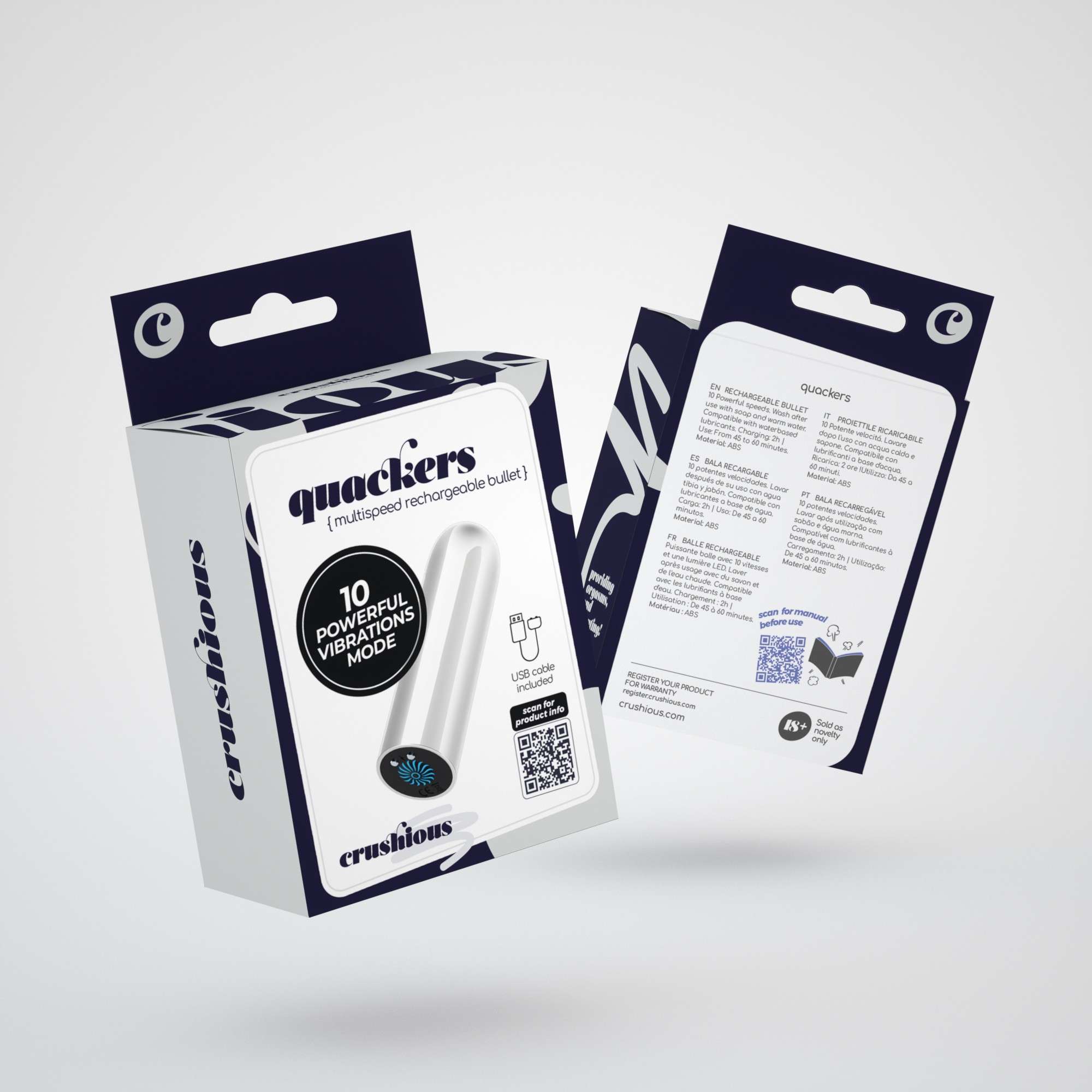 Les lignes élégantes et futuristes sont idéales pour l’utiliser seul ou en couple, tant les corps masculins comme les corps féminins atteignent des moments de plaisir intense quand ils utilisent Quackers.