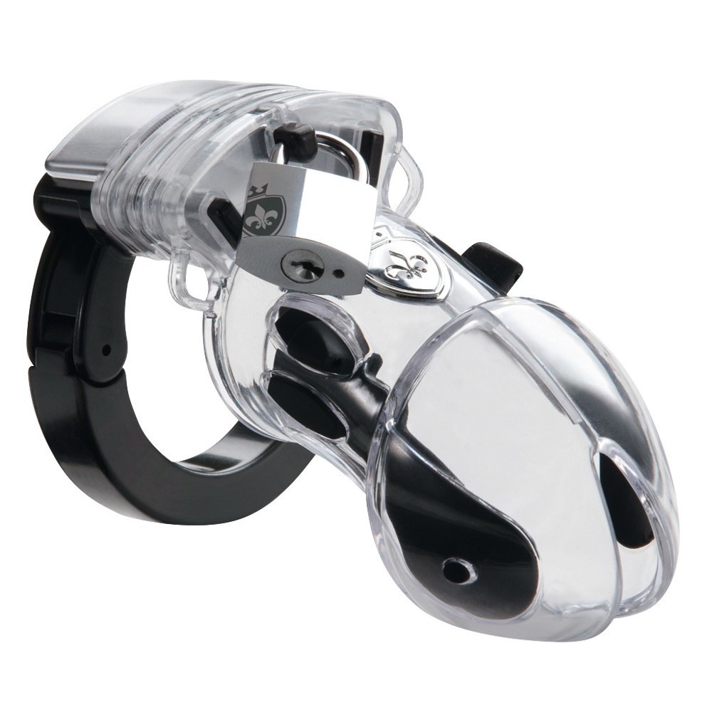 Cage à pénis en silicone ferme, équipée d'un harnais, de vis, de trois entretoises, d'une serrure métallique avec deux clés, d'un câble d'électrodes, de cinq sceaux synthétiques et de dix signes de possession. Un ensemble complet pour un contrôle sûr et confortable.
