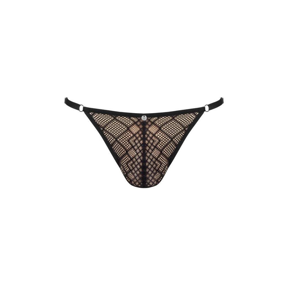 String noir Severio, de la marque Obsessive, en tissu semi-transparent avec des motifs extravagants. Doux et élastique, il offre un confort total. Taille élastique confortable, avec un petit élément métallique à l'avant et un ajustement réglable pour un ajustement parfait.