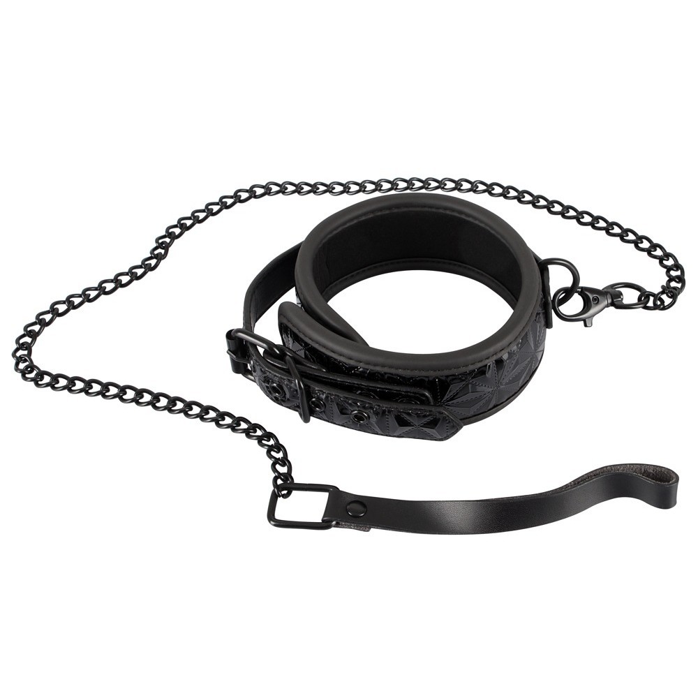 Ce collier noir, légèrement rembourré, dégage un charme exquis. Sa surface gaufrée, ornée d'un élégant motif en forme de diamant, lui confère un aspect sophistiqué et sensuel.