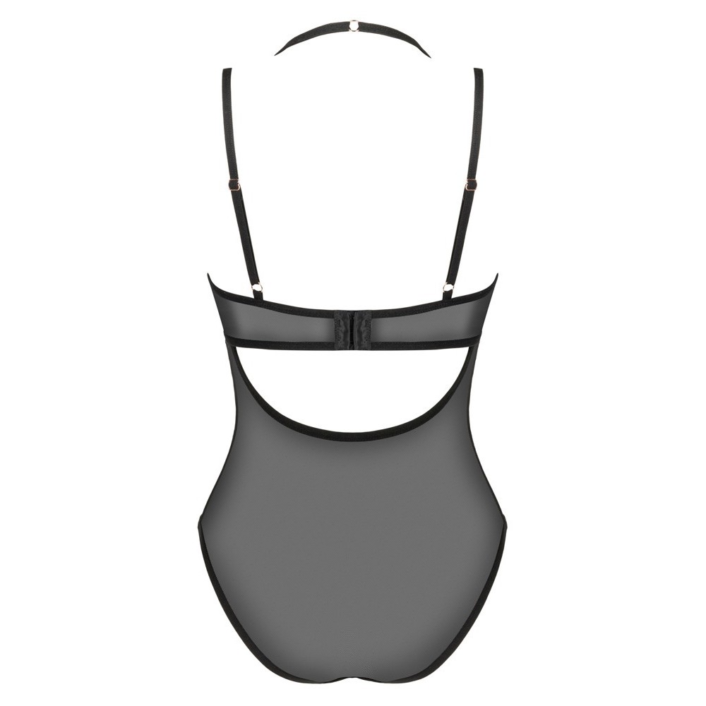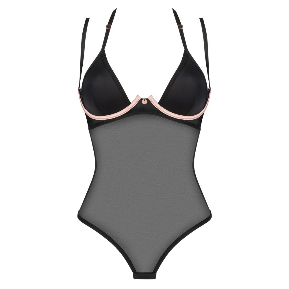 Le body Selinne noir d'Obsessive associe une maille élastique douce à des bonnets opaques en microfibre douce et des armatures roses contrastées, soulignant élégamment la poitrine. Le dos ouvert avec fermeture à agrafes réglable et le décolleté dos nu avec bretelles réglables garantissent un ajustement parfait, alliant confort et sensualité en un seul modèle.
