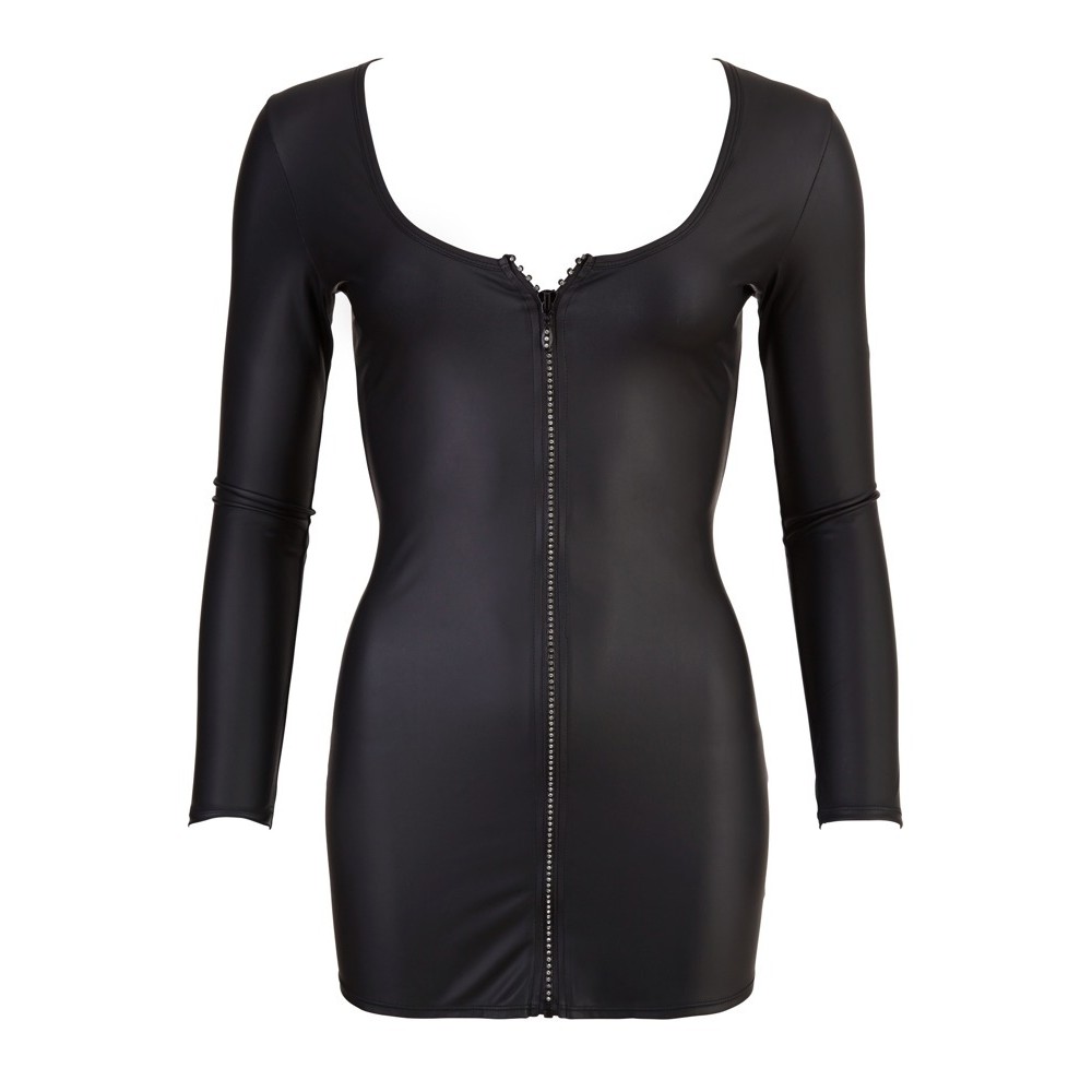 Mini-robe noire moulante à manches longues qui épouse le corps, soulignant les courbes féminines, avec un décolleté sensuel et une fermeture éclair sur le devant qui ajoute une touche irrésistible.