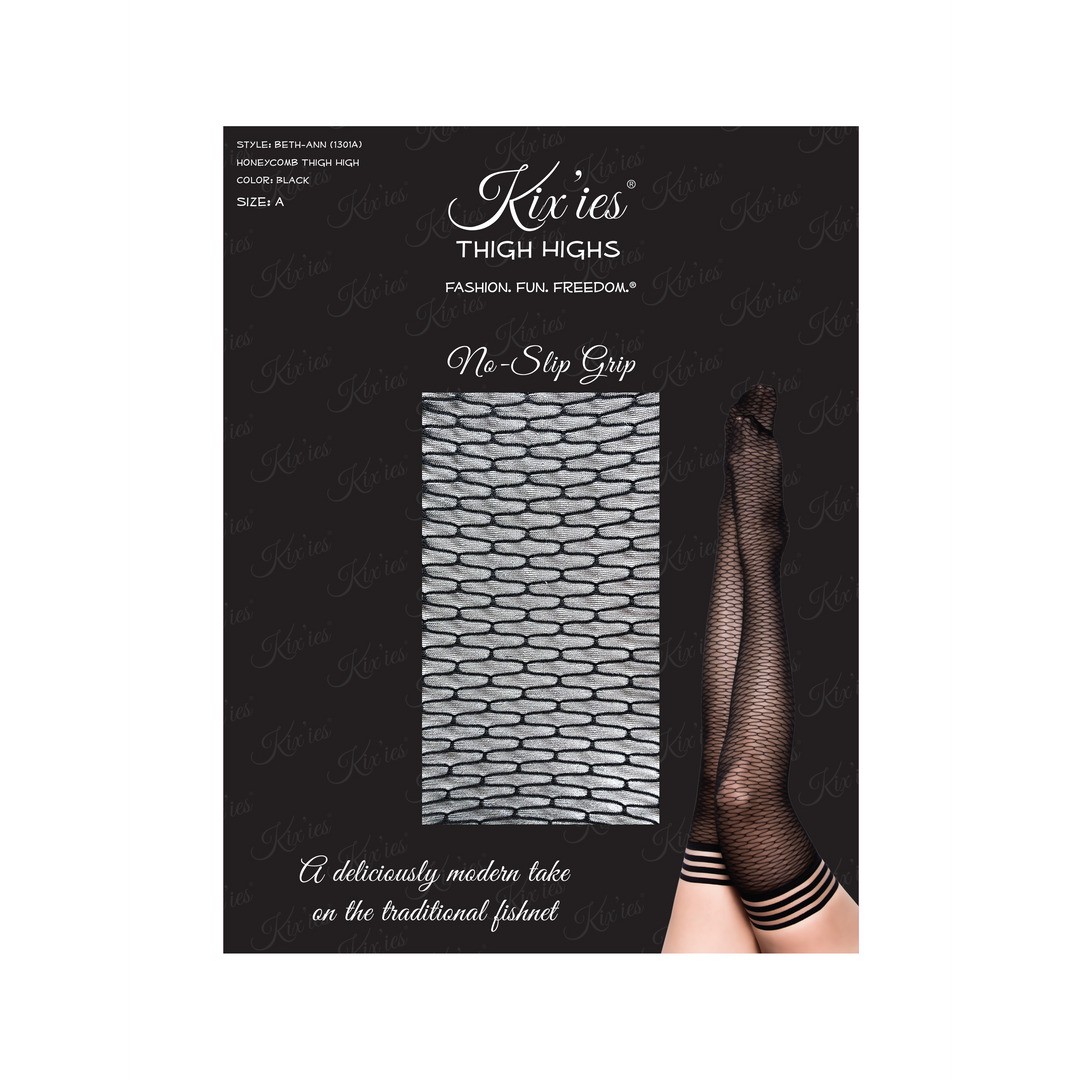 Bas à jarretelles Kix'ies en résille nid d'abeille, confortables, antidérapants et parfaits pour une utilisation prolongée, avec un style classique et moderne.