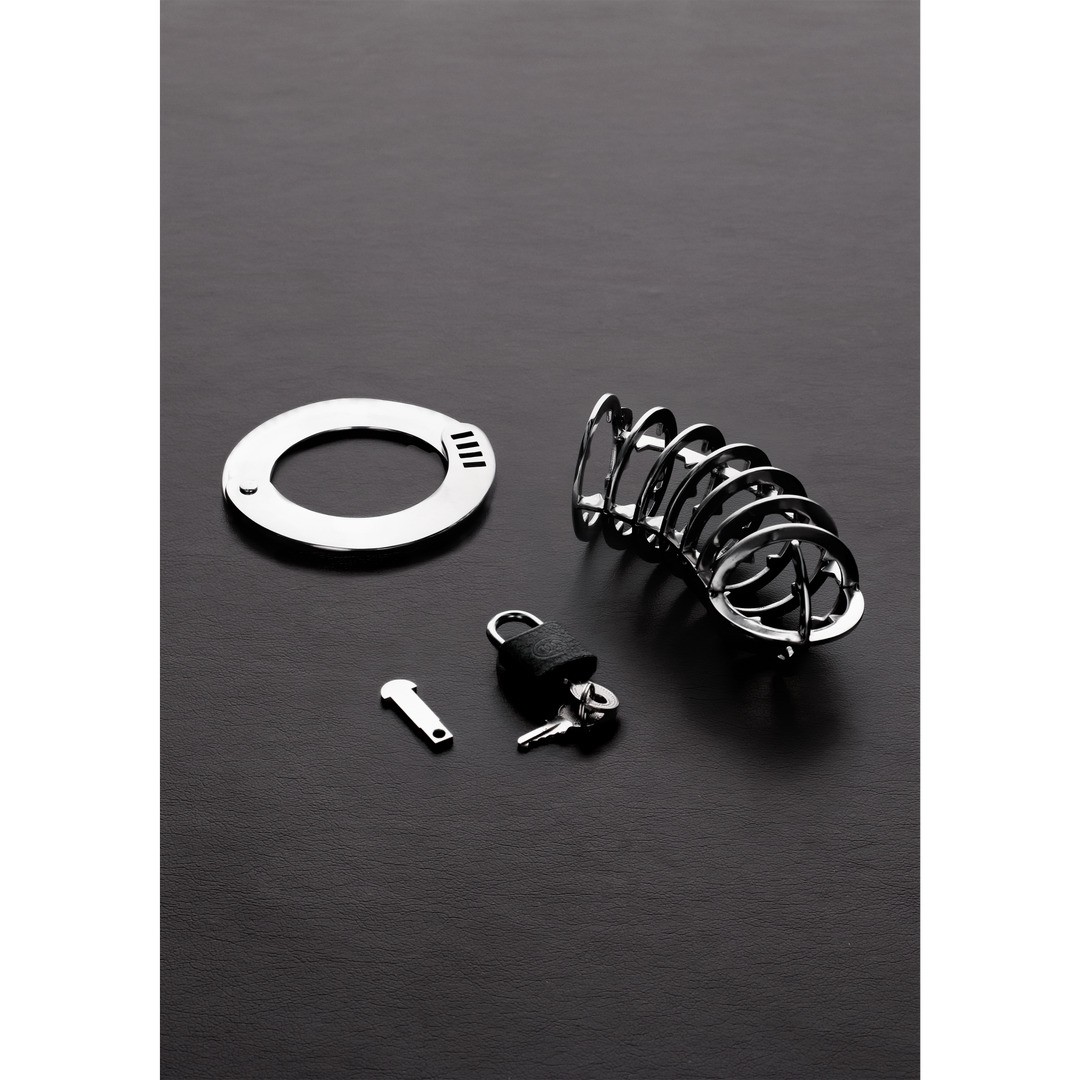 D'une longueur supérieure à la moyenne, la cage comporte sept anneaux à pointes, commençant à la base et se terminant par quatre pointes à l'intérieur de la zone du gland.