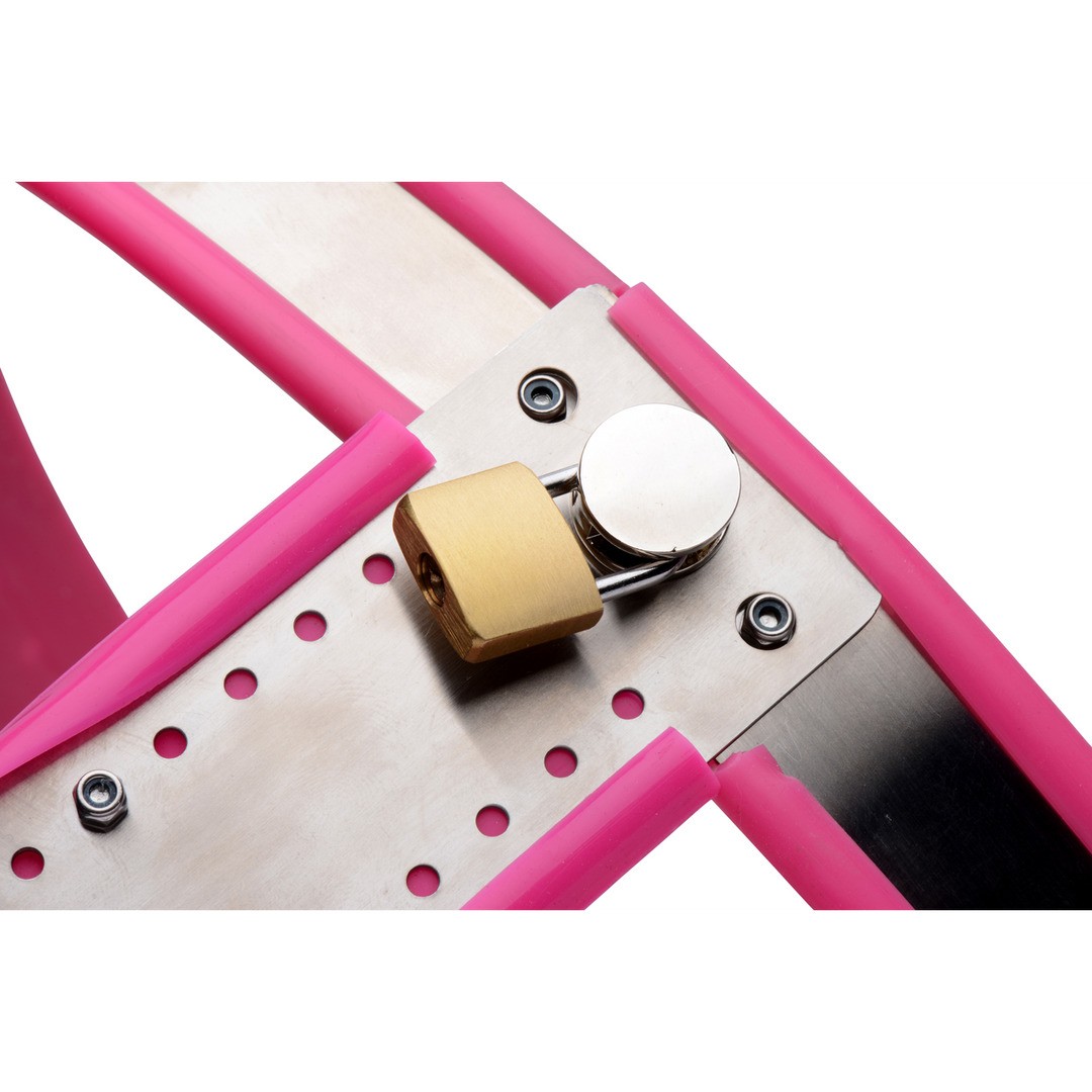 Ceinture de chasteté en acier inoxydable avec doublure en silicone rose, confortable et ajustable pour une soumission sûre et discrète.