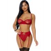 Ensemble de lingerie en dentelle découpée avec soutien-gorge à armatures, porte-jarretelles et string, présenté dans une boîte.