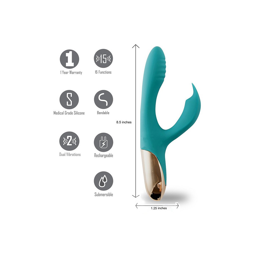 Ce vibrateur est doté de deux moteurs indépendants, chacun offrant 15 fonctions de vibration et une intensité progressive. Il est entièrement rechargeable et revêtu d'un silicone 100 % sans danger pour le corps. Pour s'amuser dans l'eau, Skyler est entièrement submersible.
