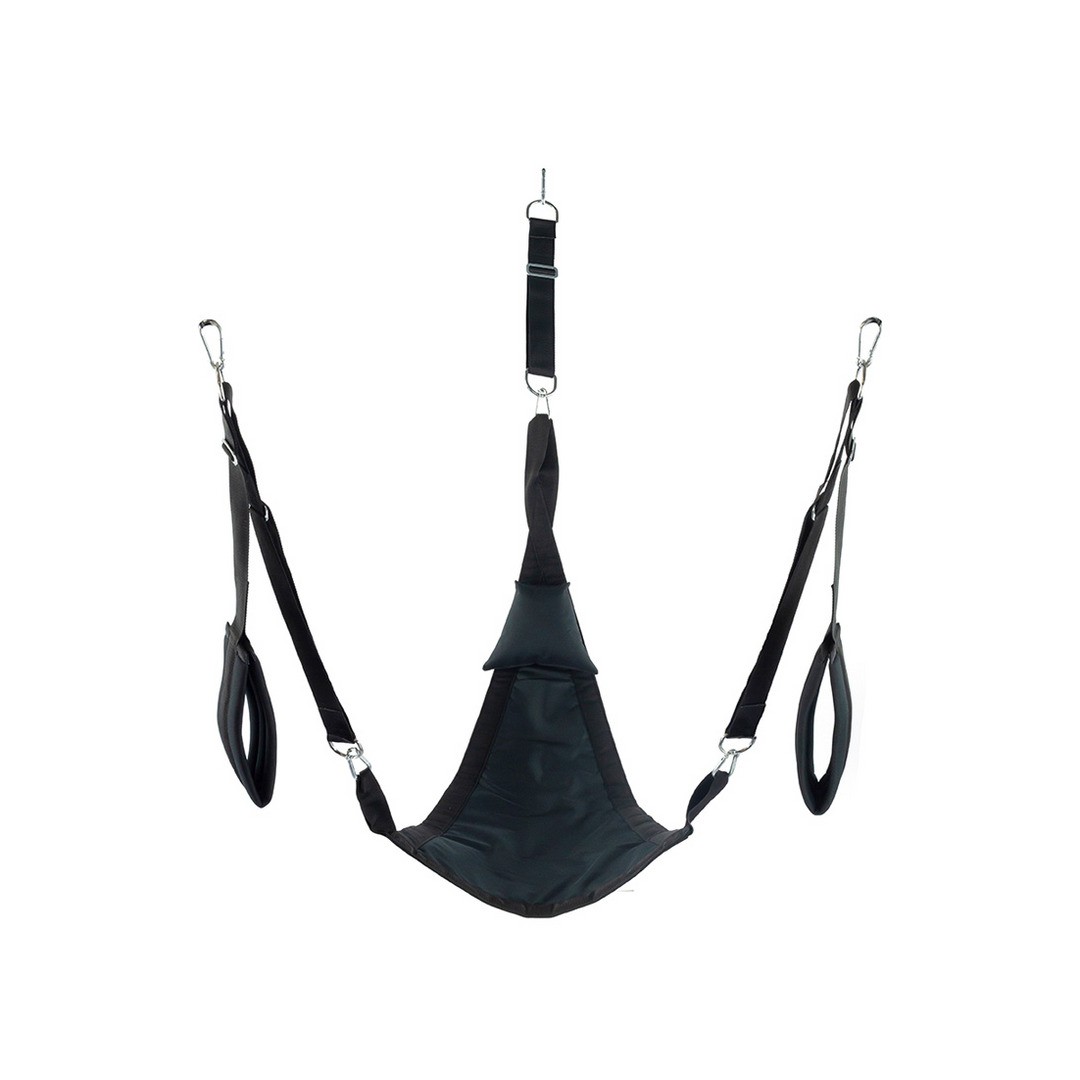 Ce balançoire en tissu noir a été conçu avec une forme triangulaire et un tissu camouflage. Il s'ajuste à l'aide de 3 ou 4 points de fixation. Il comprend les accessoires suivants: 4 crochets avec mousquetons métalliques, des repose-pieds rembourrés (11 cm de large) et un coussin triangulaire noir (24 x 20 cm).