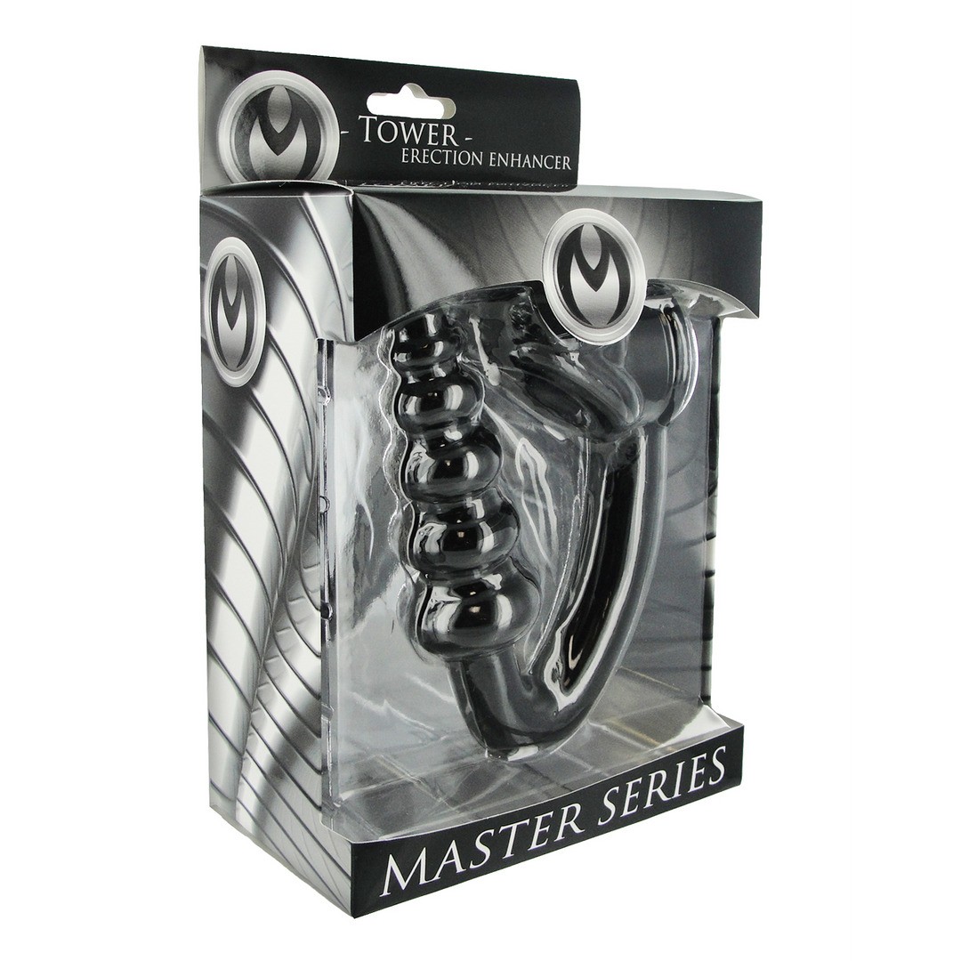 Cette pièce combine un anneau pour le pénis et les testicules avec un plug anal en forme de tour graduée, permettant une stimulation intense et progressive.
