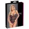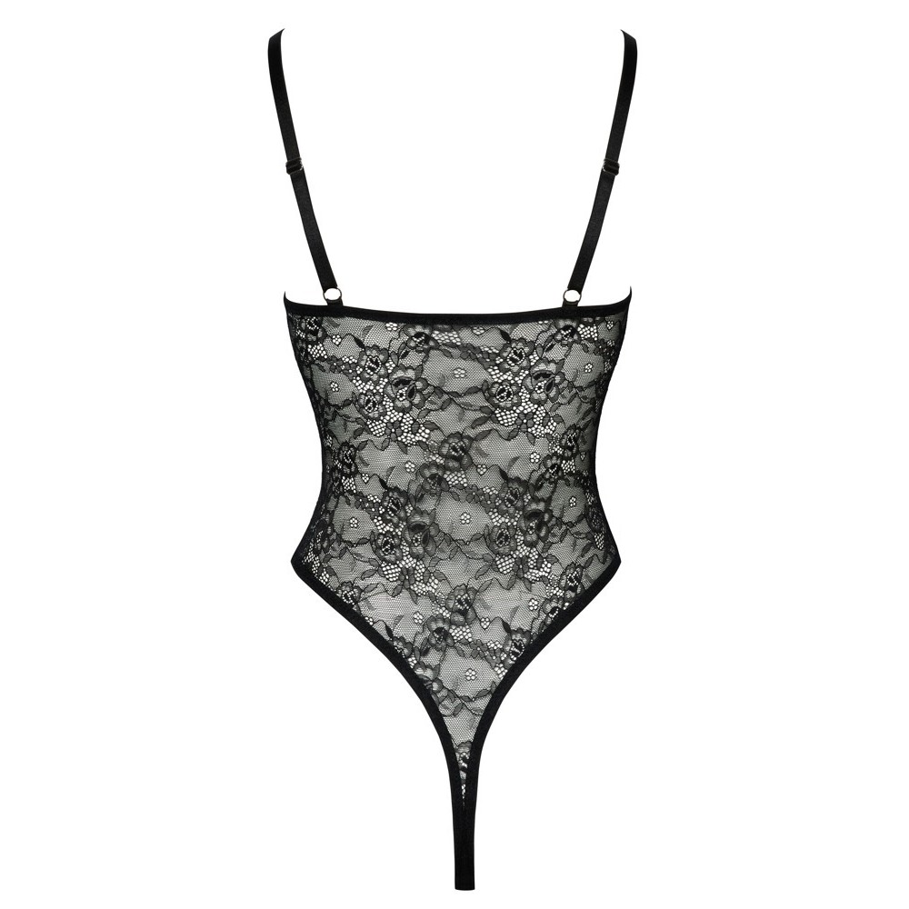 Body sans bretelles Cottelli LINGERIE en fine dentelle florale noire, douce et élastique. Avec des bretelles élégantes et élastiques et des anneaux décoratifs argentés au niveau du décolleté. Les bretelles sont réglables. Les découpes extra hautes sur les jambes mettent en valeur les fesses et les jambes. Séduisant, il est ouvert sur le mont de Vénus et l'entrejambe.
