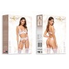 Voici l'ensemble de lingerie blanche sensuelle Rose set, qui comprend un soutien-gorge, un string et un porte-jarretelles.