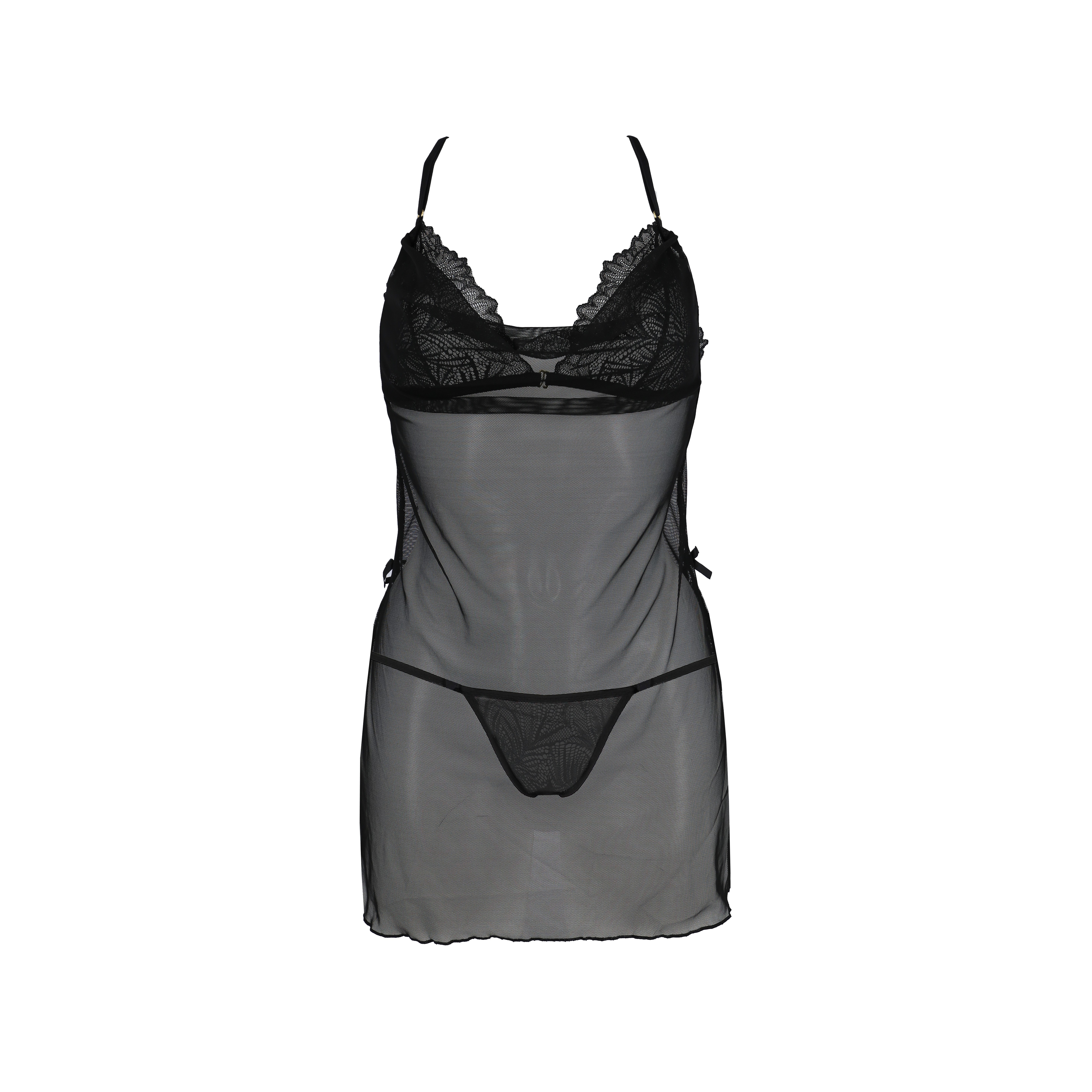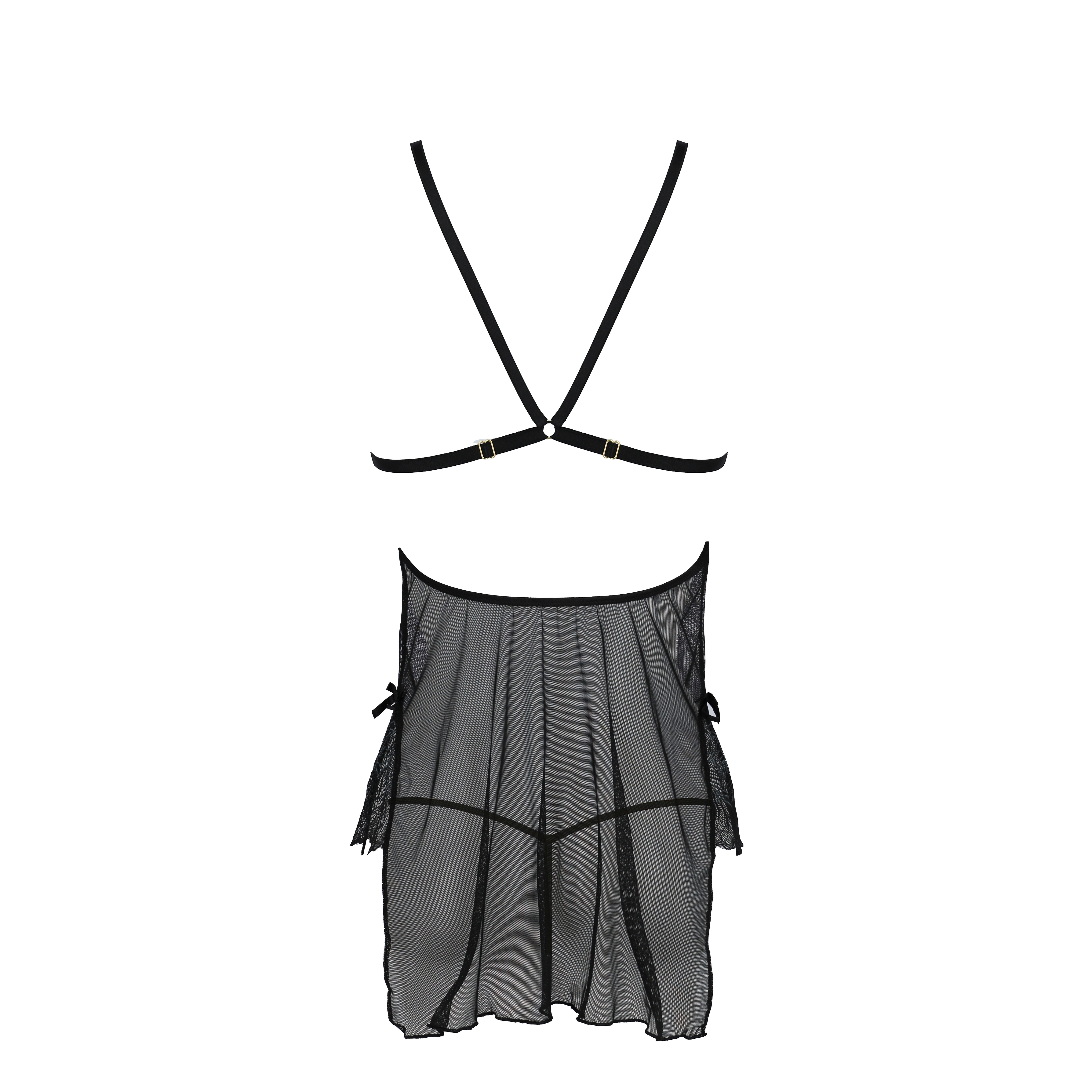 Le tulle noir, délicat et aérien, apporte une légère transparence qui éveille les sens. De fins détails en dentelle soulignent l'encolure et les ourlets, créant un contraste séduisant et sophistiqué.