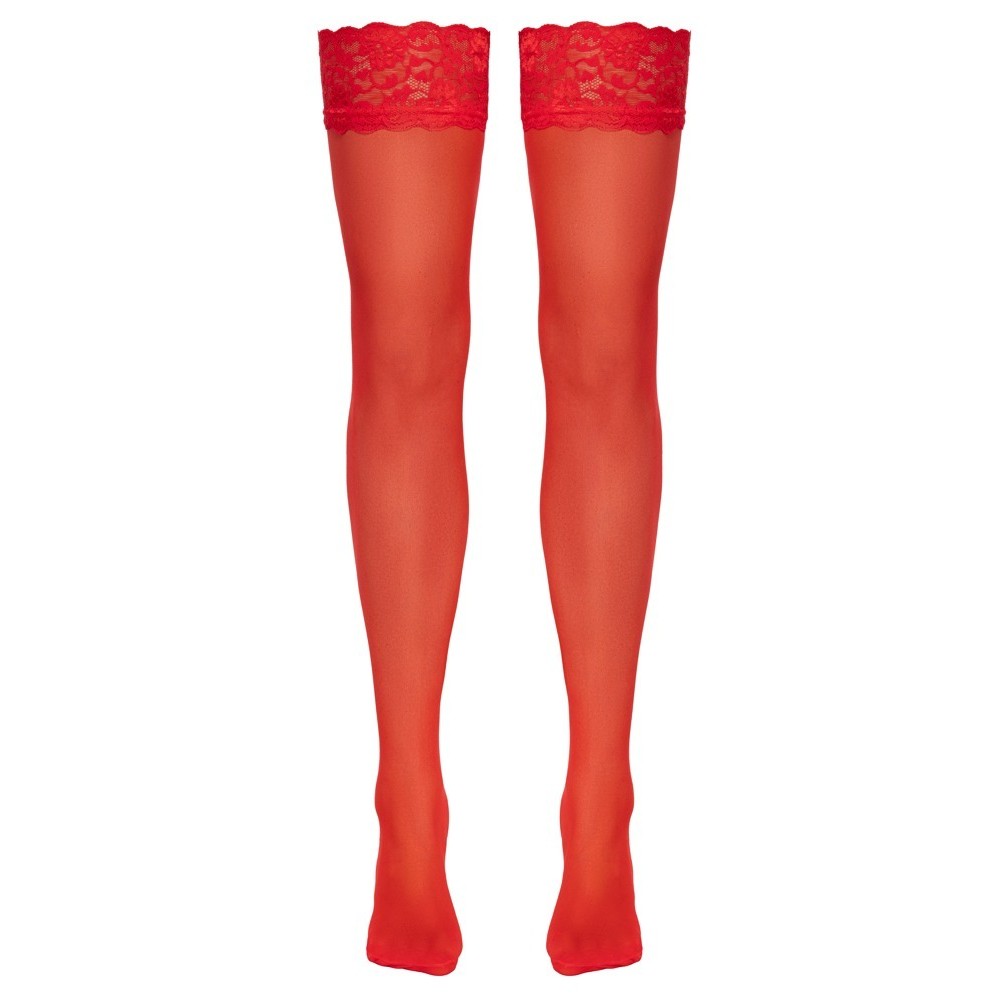 Les bas rouges veloutés de Cottelli LEGWARE sont dotés d'une dentelle extensible de 9 cm de large sur le dessus. 20 deniers. Certifié Oeko-Tex.