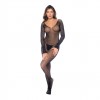 Catsuit classique en maille résille à manches longues, réinventée avec des strass scintillants pour un look luxueux et éblouissant.