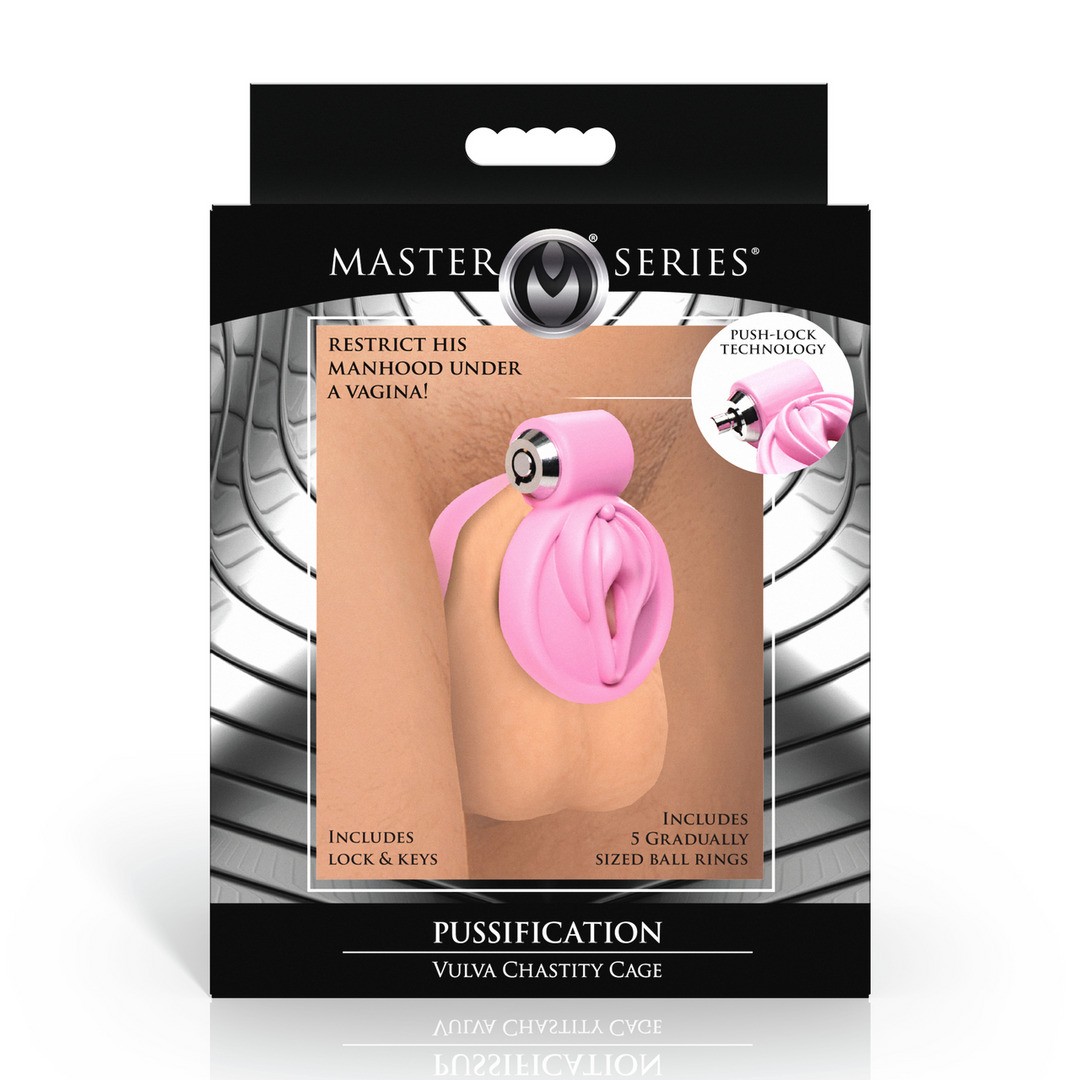 Cage de chasteté métallique féminisante, avec couvercle en forme de vulve et anneaux réglables pour un maintien sûr.