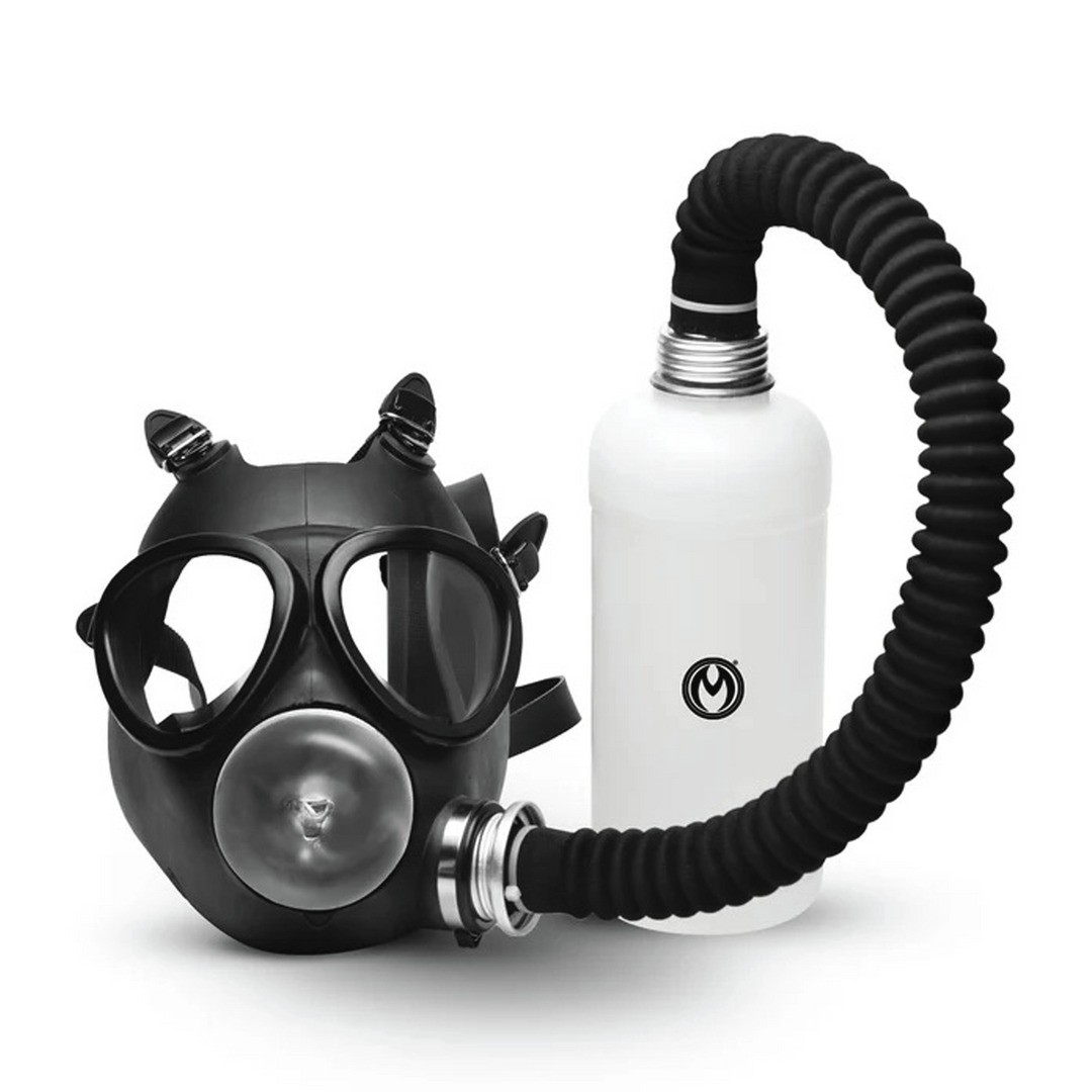 Masque à gaz érotique avec valve unidirectionnelle, manche masturbatoire et flacon d'arôme pour un jeu respiratoire intense.