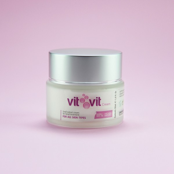 La crema di lumaca VIT VIT è un complesso 100% naturale, formulato da un'alta concentrazione di proteine con effetti rigeneranti e riparatori della bava di lumaca (Helix Aspersa) e altri principi attivi. Questo insieme di ingredienti agisce stimolando la sintesi di collagene ed elastina, favorendo la rigenerazione delle pelli che hanno già i primi segni dell'invecchiamento. Le sue proprietà riparative sono responsabili del rinnovamento dei tessuti che presentano rughe, macchie, segni o cicatrici. Particolarmente adatto per la pelle grassa e incline all'acne.