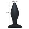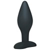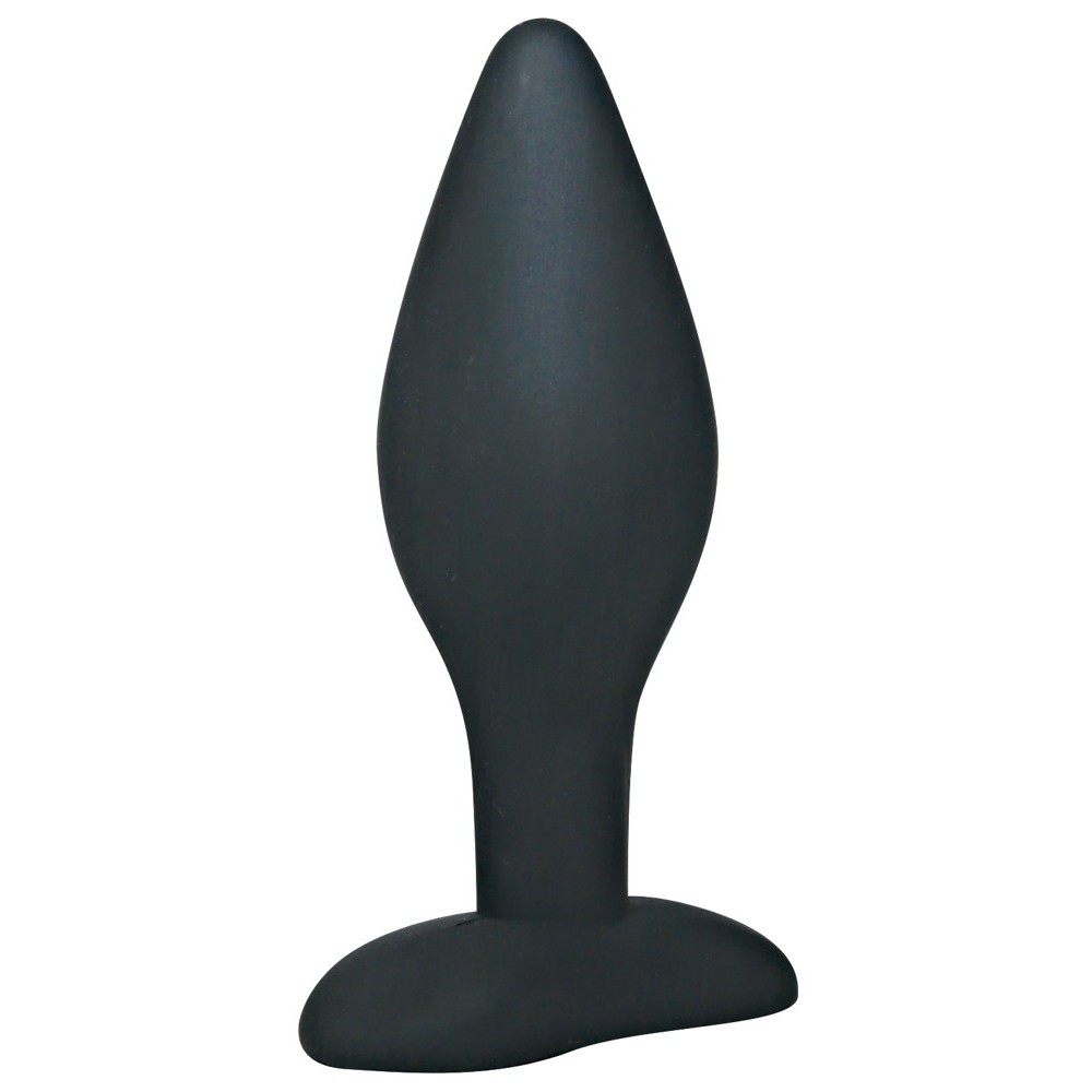 Plug anale nero con punta stretta e fusto largo. Superficie liscia e setosa per una stimolazione senza attrito. Con base.